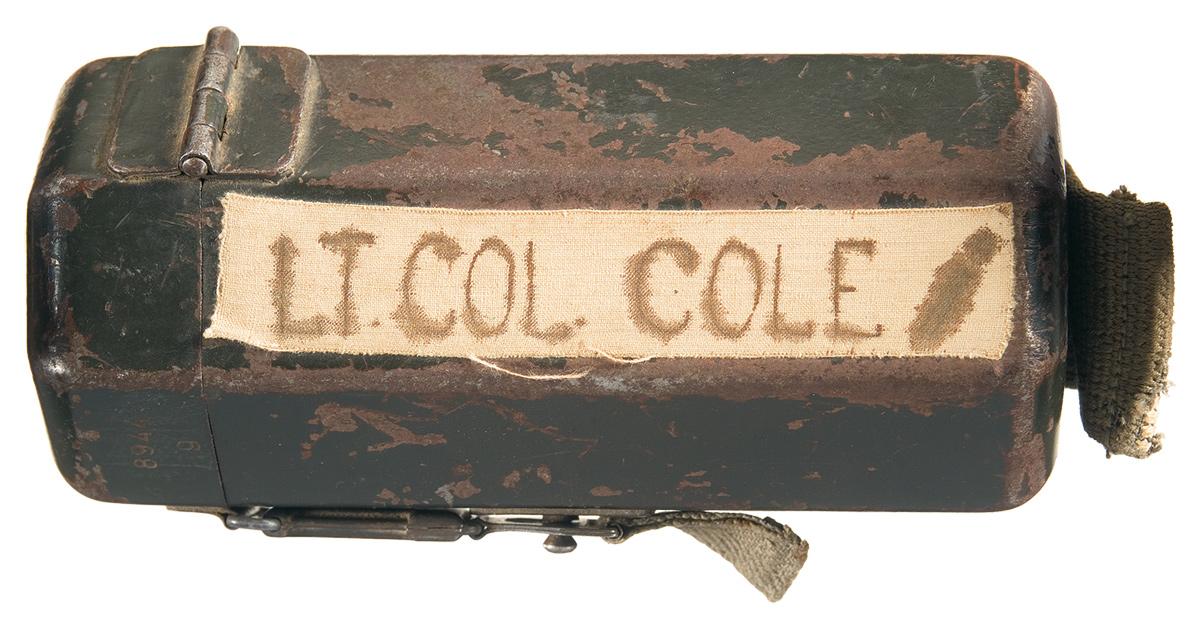 This is a fine example of a standard K98 rifle that was fitted with the ZF41 sharpshooters rifle scope. These scopes were 1.5 power and were actually intended as a low-cost shooting aid for the German soldier allowing him to increase hit probability at extended ranges. They were mounted forward from the receiver to not interfere with the function of the rifle. This rifle is a late 1944 production manufactured by the Mauser factory, that has an original rear sight base with the scope mounting dovetail machined on the left side, that is made specifically for ZF-41 scopes. The receiver is marked "byf44" and Mod 98 on the receiver ring. The right side of the receiver and the upper rear corner of the rear sight base have the correct eagle 135 acceptance proofs and the left side of the receiver and rear portion of the barrel have the large eagle firing proof as applied by the Mauser factory. The stock and handguard are the correct laminated versions that have a nice dark brown color from age. The rifle has the correct late style stamped and welded upper barrel band with a milled lower barrel band. The trigger guard and floor plate are both the late war stamped versions and the trigger guard itself has a double eagle 135 acceptance proof. The rifle is fitted with the correct late war laminated stock and handguard set, with the right side of the buttstock, the under side and pistol grip area each having a single WaA135 Waffenamt proof. The ZF41 scope is marked "963/fzg/ZF41" on the side of the tube and is fitted in a current reproduction mount that has been numbered on the side "8944g/eagle 214" proof. The scope is fitted with a set of original sunshades and is housed in an original ZF41 scope can with a cleaning cloth and lens brush inside, with an old piece of medical tape running down the side that is marked "LT. COL. COLE". The rifle is complete with a cleaning rod, reproduction front sight cover and original leather cross-hatched sling.