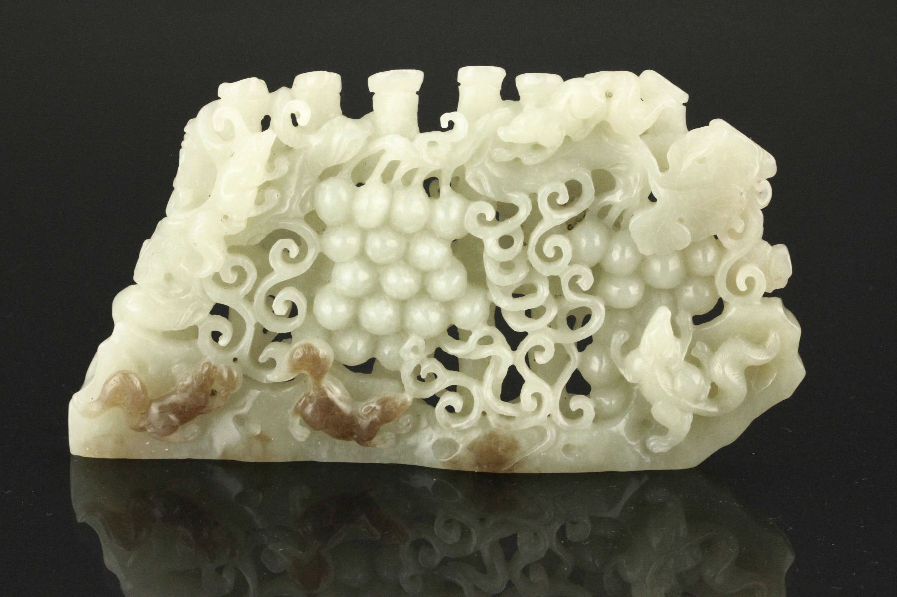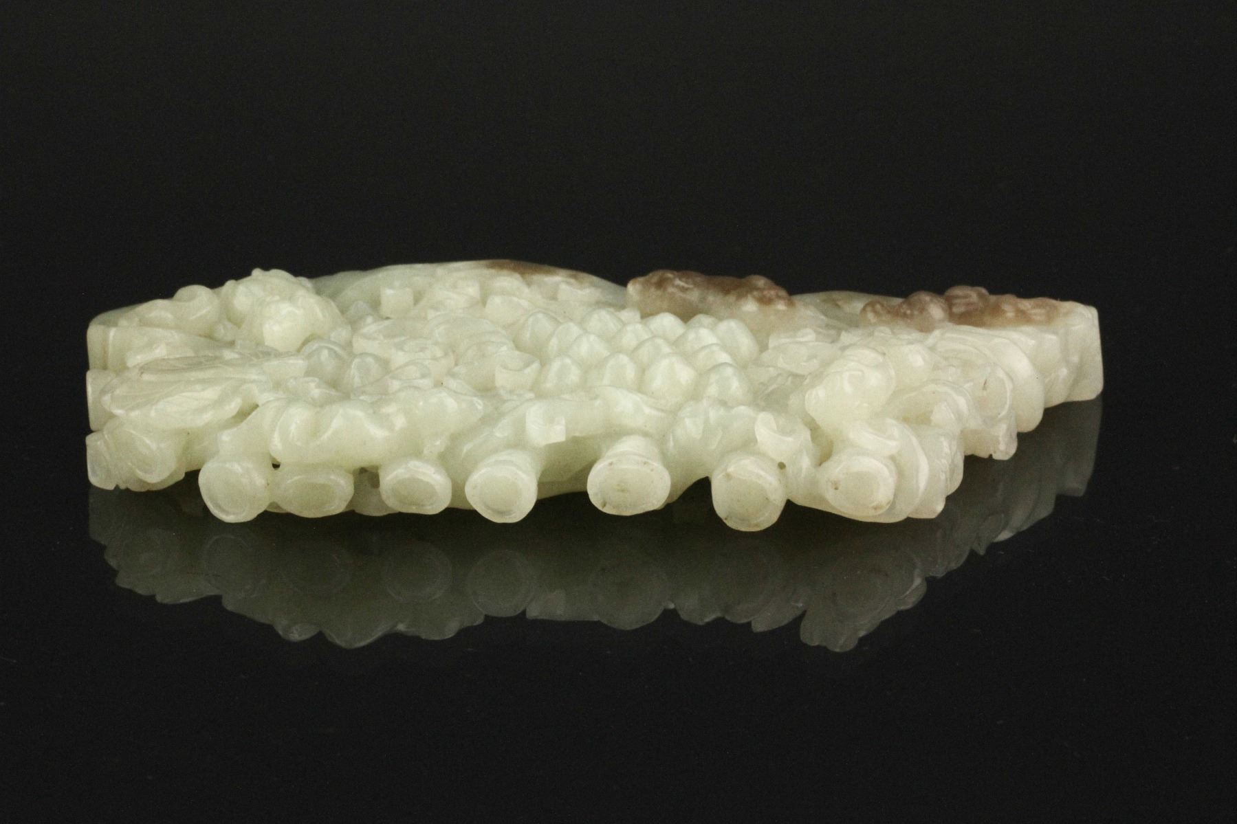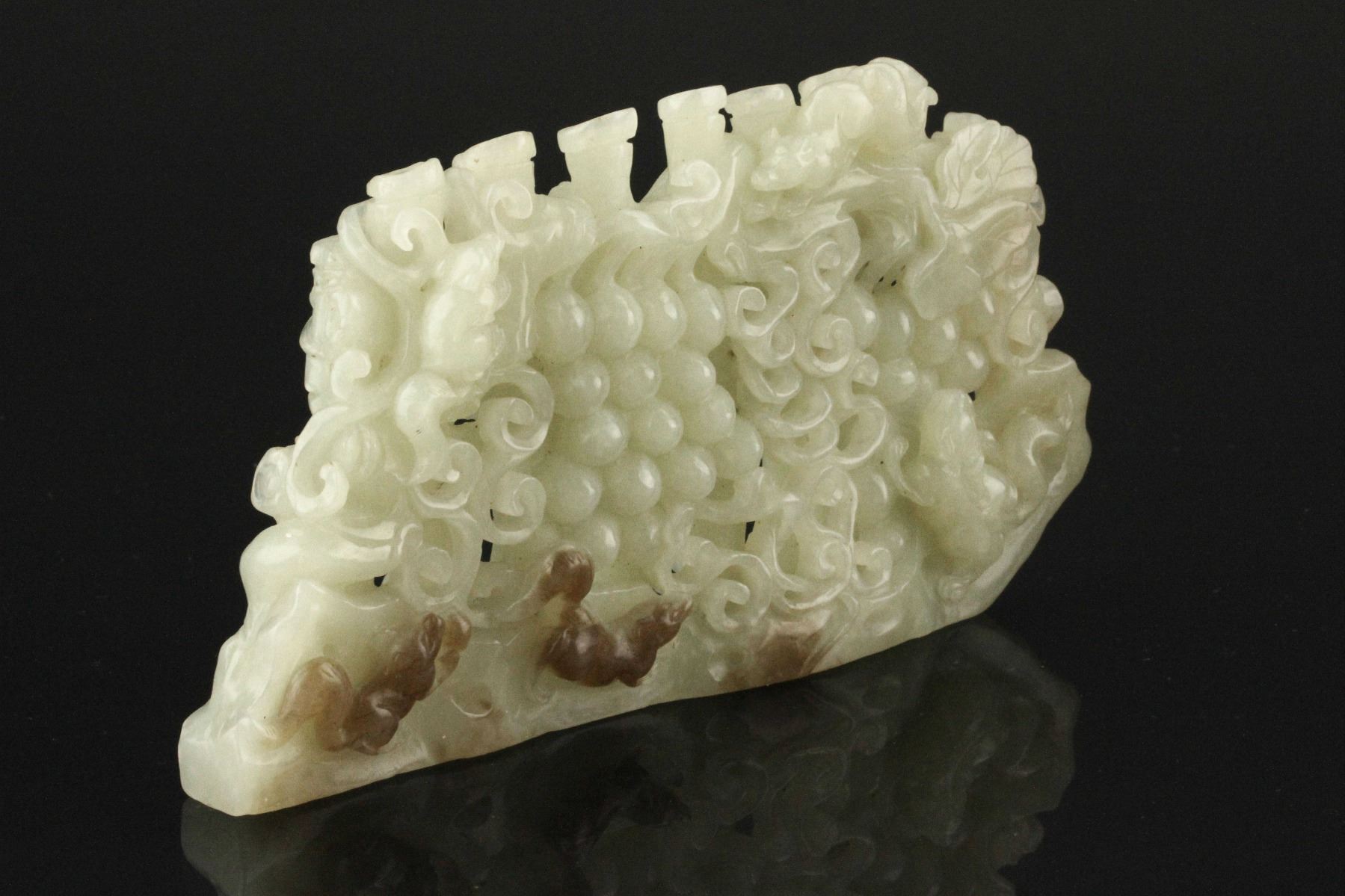 Fine Chinese jade cravings, of celadon colour with dark inclusions, five sinuous fu mouse carved in relief along the grape vines. The backside revealing bamboo scaffold. H: 7 cm, L: 12 cm, 214 grams. Provenance: T. Ng Collection Toronto