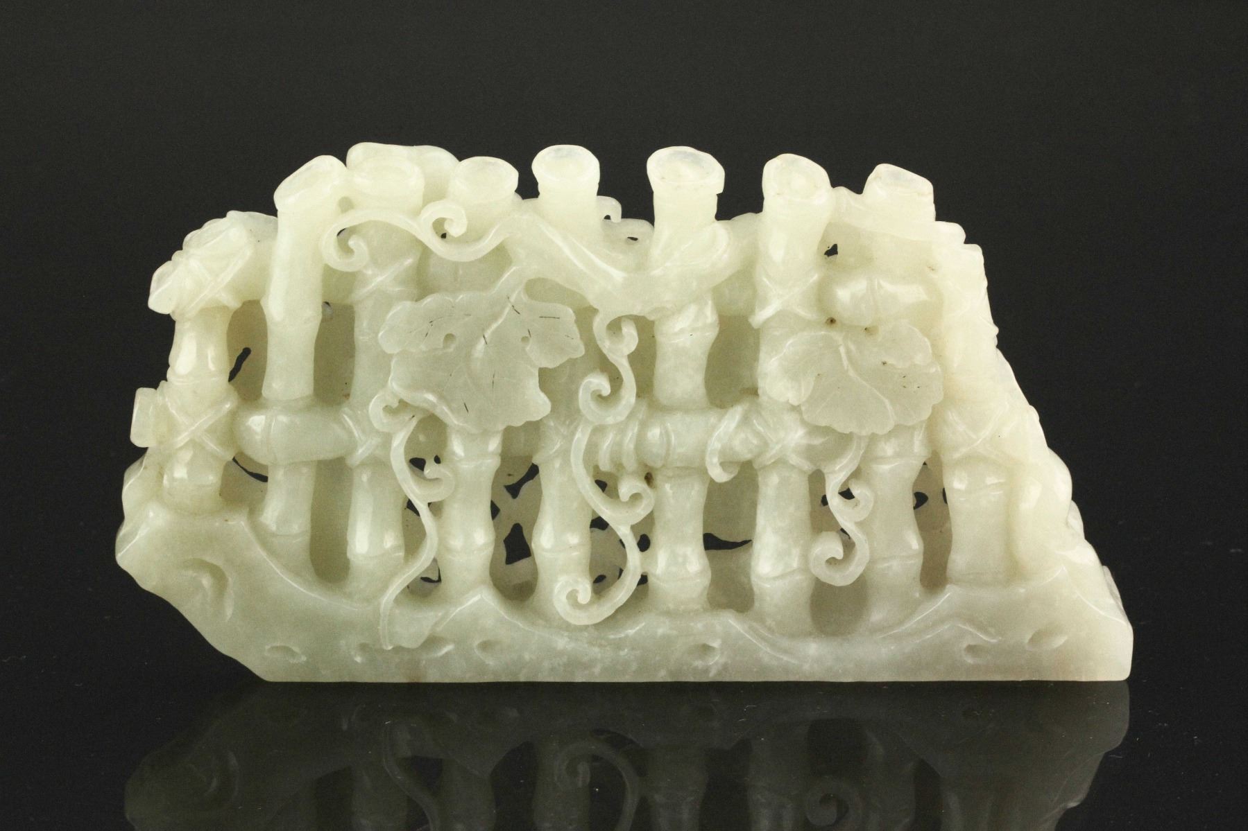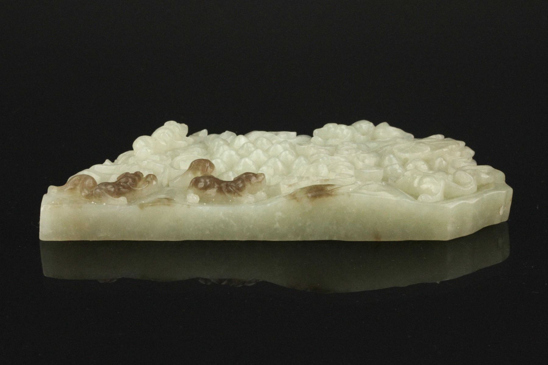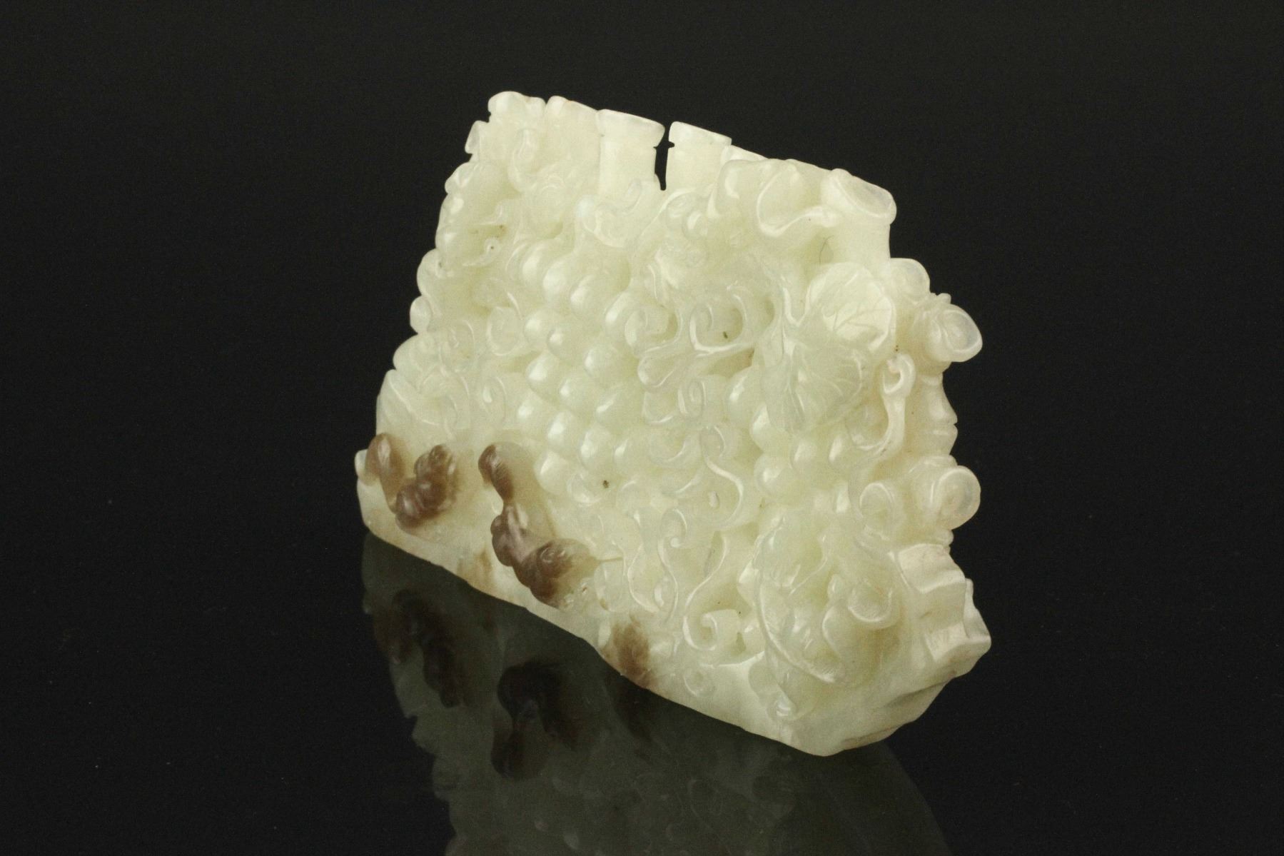 Fine Chinese jade cravings, of celadon colour with dark inclusions, five sinuous fu mouse carved in relief along the grape vines. The backside revealing bamboo scaffold. H: 7 cm, L: 12 cm, 214 grams. Provenance: T. Ng Collection Toronto
