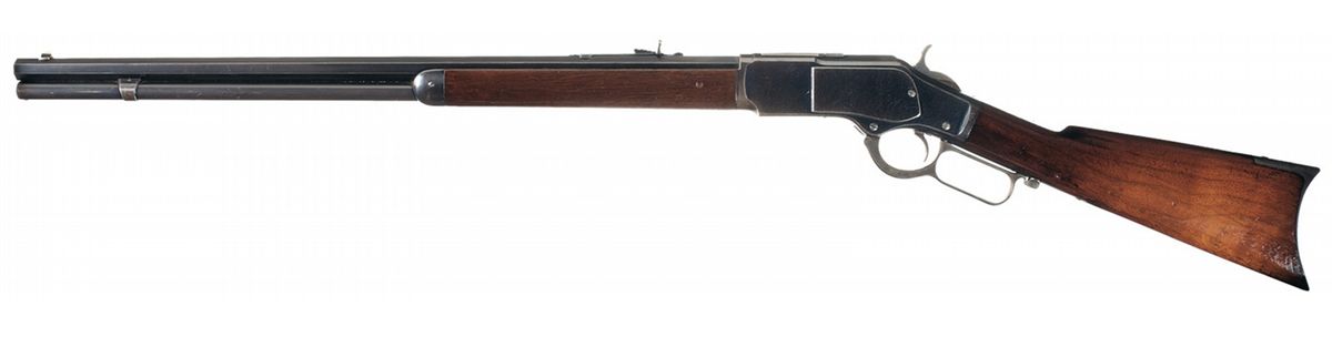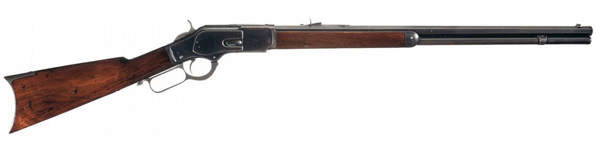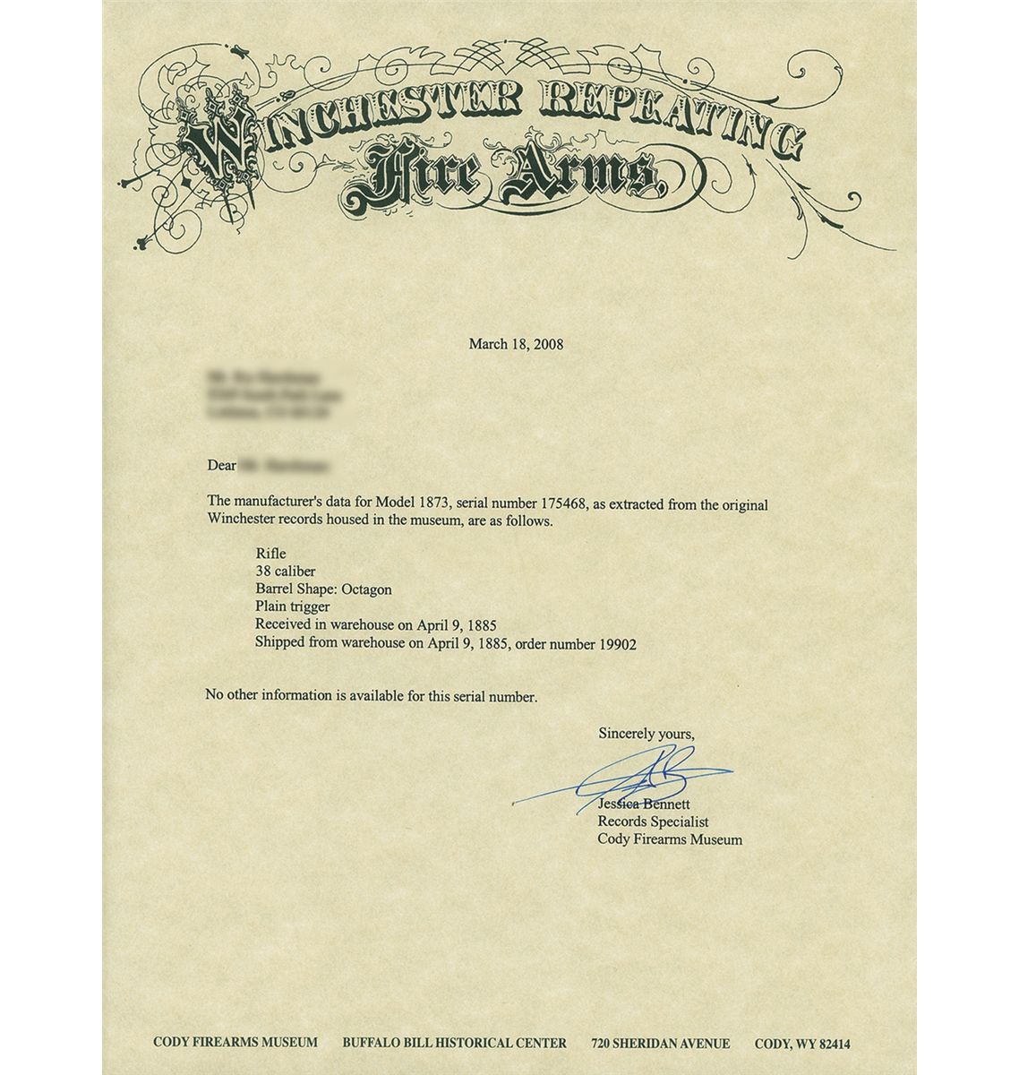 This is a very fine example of a Winchester Model 1873 Lever Action Rifle. The factory letter confirms the serial number, rifle configuration, octagon barrel, and plain trigger. The rifle was received in warehouse on April 9, 1885 and shipped from the warehouse on the same day on order number 19902. The rifle has the Third Model integral dust cover rail, dust cover with serrated edges and concealed trigger pin. The 24-inch octagon barrel, full-length magazine, forearm cap and receiver have the Winchester high polish blue finish. The loading gate is niter blue. The hammer, loading lever and crescent buttplate are color casehardened. The buttplate has a sliding brass trap door and the upper tang is factory drilled and tapped for a tang mounted rear sight. The straight grain, black walnut stock and forearm have an oil finish. The barrel is fitted with a dovetail mounted sporting style front sight with nickel-silver blade and a sporting style rear sight with serrated edges. The top of the barrel is roll-stamped with the two-line legend "WINCHESTER'S-REPEATING-ARMS. NEW HAVEN.CT./KING"S-IMPROVEMENT-PATENTED-MARCH. 29. 1886. OCTOBER 16. 1860.". "38-Cal." is roll-stamped on the top of the barrel just in front of the receiver. The bottom of the brass cartridge elevator is roll-stamped "38 CAL". The upper receiver tang is roll-stamped "MODEL. 1873." in fancy letters with foliate designs at either end. The serial number is stamped in script on the lower tang between the lever latch and the tang screw. The four piece cleaning rod is included with the rifle.