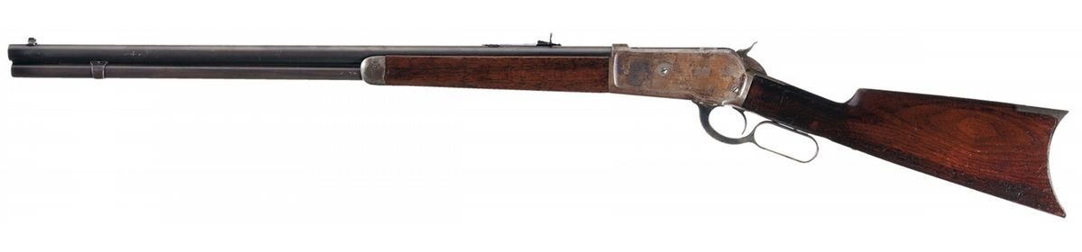 Manufactured in 1890. This casehardened frame Model 1886 Lever Action Rifle has a blade front sight (bead missing), an adjustable buckhorn rear sight and a full length magazine tube. The top of the round barrel has the two line address stamped ahead of the rear sight and "40-82 W.C.F." at the breech. The upper tang is stamped "-MODEL 1886-" and the lower tang is marked with the two line patent date and the serial number. Mounted on a smooth forearm and straight grip stock with steel forend cap and crescent buttplate.