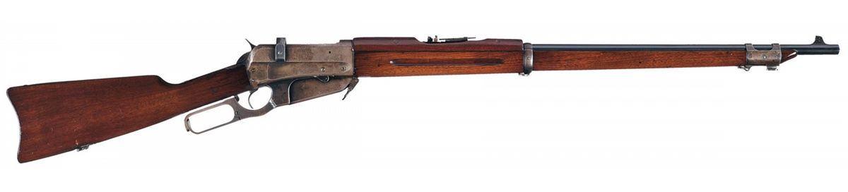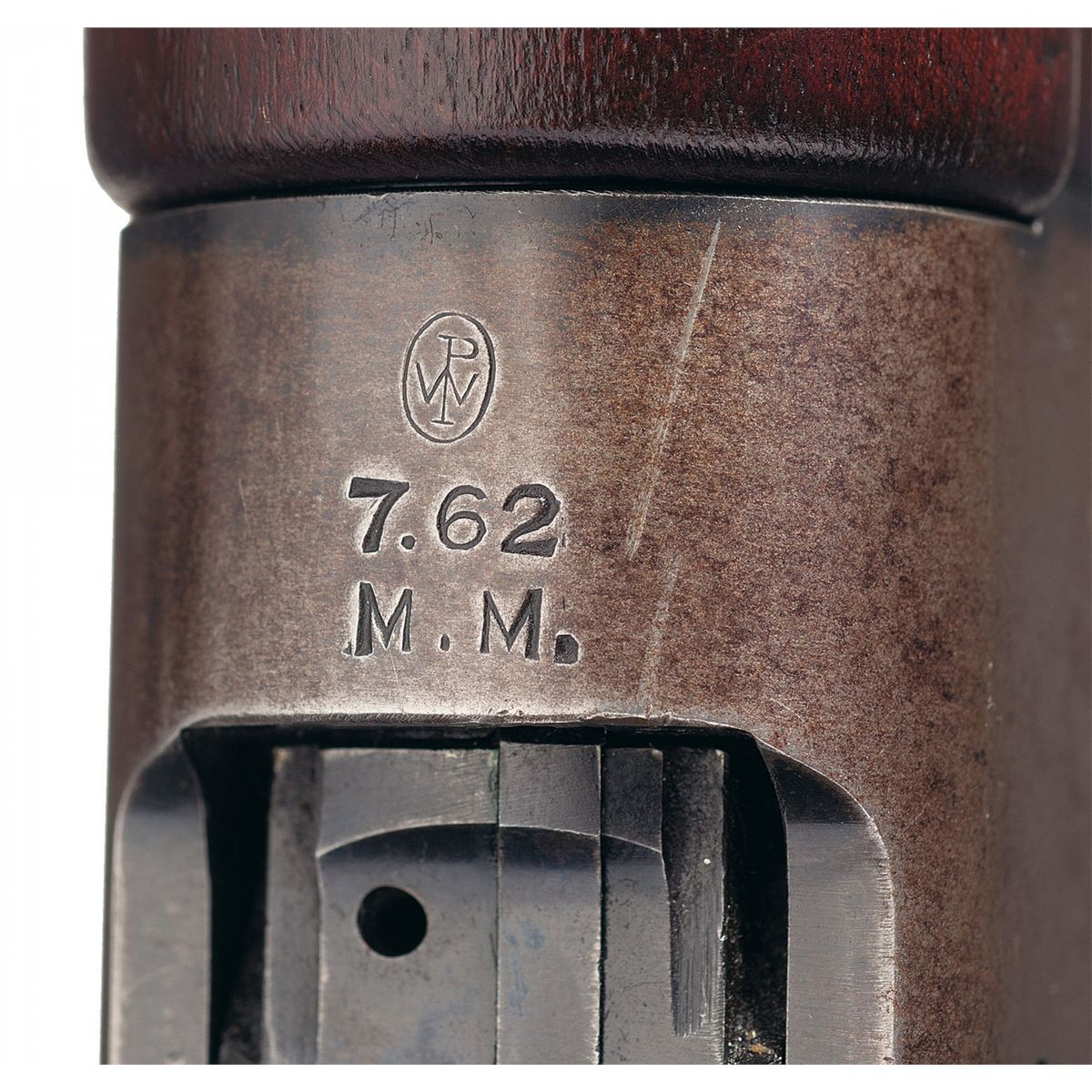 This is an example of one of the approximately 294,000 Model 1895 Muskets sold to the Imperial Russian Government between 1915 and 1916. These muskets were similar to the standard musket, but with a stripper clip guide mounted on top of the receiver, chambered for the 7.62 Russian Nagant cartridge and bayonet lug. The top of the chamber has the Winchester factory proof over "7.62/M.M.", upper tang has the three line model/trademark information and the left side of the receiver has the two line address/patent marking. Blade and folding ladder sights with the rear sight graduated to 3,200 meter. Straight grip stock with a full length finger groove forearm, upper hand guard and carbine buttplate with compartment (bore brush and tool not included).