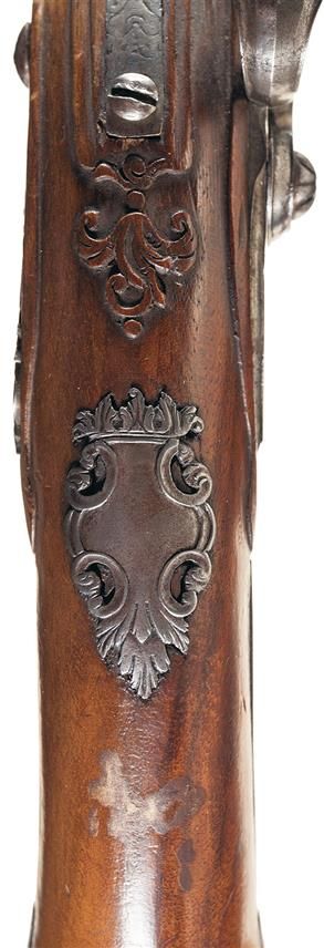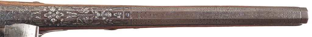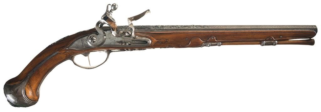 This attractive flintlock pistol features a 12 inch octagon barrel with an engraved geometric design on the forward half and silver relief chiseled breech half. The metal surfaces, (except for the aforementioned rear half of the barrel), are finished bright. The lock is marked "FIEVEZ" directly behind the hammer and "A*NAMVR" ahead of the hammer. The pistol is approximately 19 1/2 inches in length. The wooden ramrod is secured by two decorative pipes. Mounted on a full walnut stock with teardrop flats, decoratively engraved left side plate with a dragon and man's head, decorative trigger guard finial, decorative engraved thumb shield and buttplate with a grotesque face. The stock is raised relief carved with decorative accents.