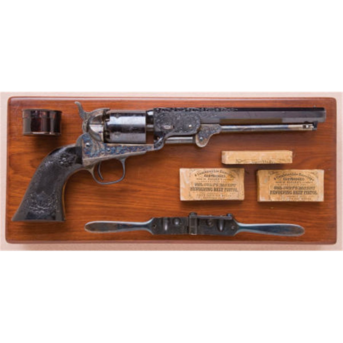 Fine and Exceptional Cased, Engraved and Relief Carved and Checkered Ebony-Gripped Colt Model 1851 Navy Revolver, Known as "The Black Beauty" Serial number 163902/. .36 caliber, 6-shot cylinder with naval engagement roll scene. 7 1/2-inch octagon barrel with brass pin front sight. Top of barrel marked: - Address Col. Saml. Colt New-York U.S. America. -Scroll and border engraved in the late vine style, with coverage on the barrel, loading lever, wedge, frame, hammer, and gripstraps. Left side of frame engraved "Colts/Patent." Wolf head motif on each side of hammer. Hand knurled hammer spur. Rich, blued finish, with case-hardened frame, hammer, and loading lever, and silver-plated brass gripstraps. The extremely rare ebony grips relief-carved and checkered, including oak leaves, acorns and American eagle on the left grip and matching American shield on the right. Shipped from the factory with the cylinder not serial-numbered, as noted on some of the other deluxe engraved arms of the period.Rare and unusual varnished mahogany case, lined in maroon velvet, with large space for packets of combustible envelope cartridges by Colt's Cartridges Works. Scarce presentation grade blued steel double cavity bullet mold, tin of Eley Bros. percussion caps with green paper label.Research in the Colt factory ledgers has documented ebony gripped revolvers engraving in this serial range, including nos. 163910 and 163901 (Book 3, page 218, column 9). As well as serial no. 163913 (in book 3, page 222, column 10, listed also as engraved).The combination of factory engraving, relief carved and checkered ebony grips, as well as the exceptional finish, and the factory ledger entries - revealing of the rarity of engraved and ebony handled Colt revolvers - confirms the exceptional importance and rarity of this unique cased set.Literature:R.L. Wilson. American Arms Collectors Percussion Colt Revolvers and Their Rivals The Al Cali Collection, pages 46-47. R.L. Wilson. Samuel Colt Presents, page 138.Provenance:Jonathan M. PeckBuddy HackettGreg MartinAl Cali