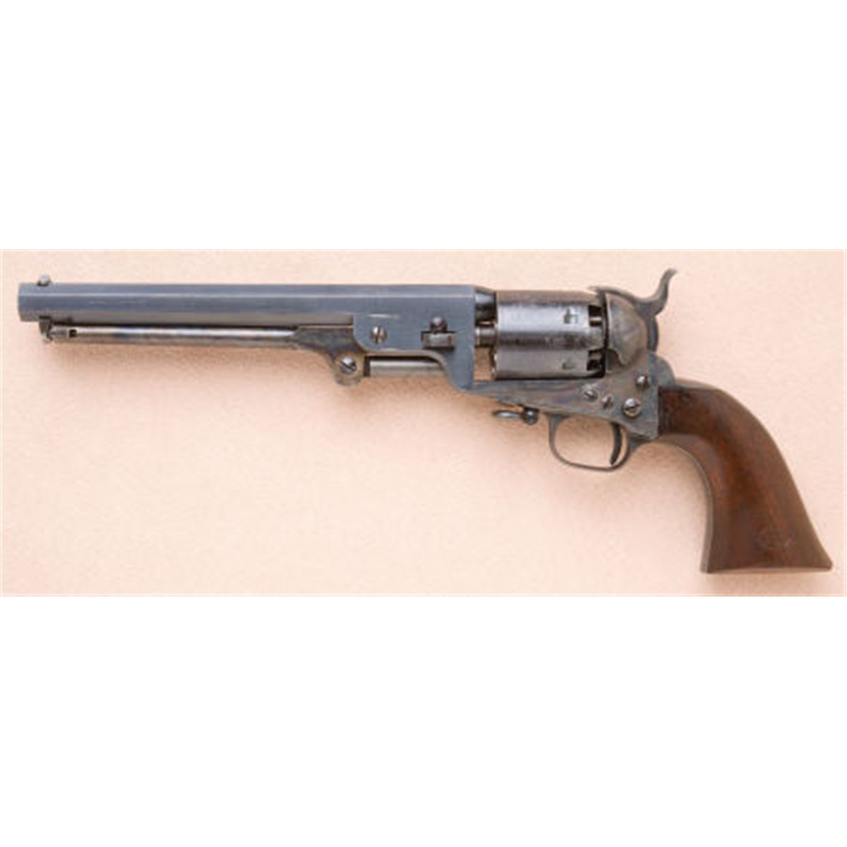 Fine and Exceptional U.S. Martially Marked Colt Model 1851 Navy Revolver, Scarce Variation Cut for Attachable Shoulder Stock Serial no. 71958. .36 caliber, 6-shot cylinder roll engraved with naval engagement scene, 7 1/2-inch barrel with standard single line:- Address Saml. Colt New York City -marking. Dovetailed steel blade front sight. Blued, with color case-hardened hammer, frame and loading lever. U.S. Left side of frame marked:ColtsPatentU.S.Oil-finished walnut grips with JH inspector cartouche on left panel, and WAT on right panel. Various individual letter inspector stamps on various parts. Blued steel gripstraps, with rare small triggerguard. Four-screw frame cut for shoulder stock attachment, with lanyard swivel mounted on front of triggerguard.The exceptional condition of this revolver, its apertures for attachment of a shoulder stock, the technical features such as the small size oval triggerguard and lanyard swivel, and the crisp and complete U.S. martial inspector markings, rank this pistol among the most desirable of all Colt Martial Model 1851 Navy handgun variations. Literature:R.L. Wilson. American Arms Collectors Percussion Colt Revolvers and Their Rivals The Al Cali Collection, page 43.Provenance:Richard ReyesAl Cali