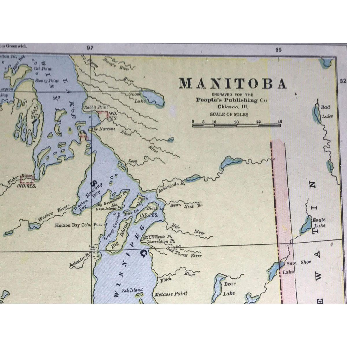 Color map of Manitoba engraved for the People’s Publishing Company. Set on backing board and shrink wrapped. 14.5â€W x 10.5â€H