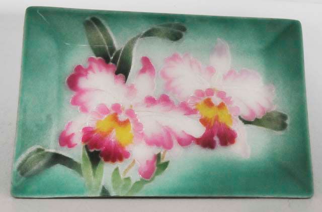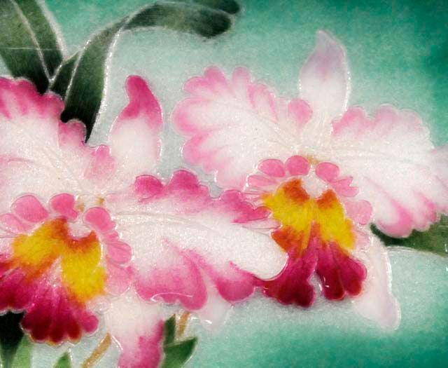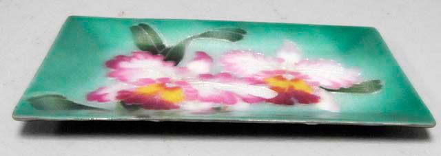 With "Orchid" decoration, enamel on silver, signed, ca. 1930. Approx. 7" x 4.5". Please read our terms of sale.