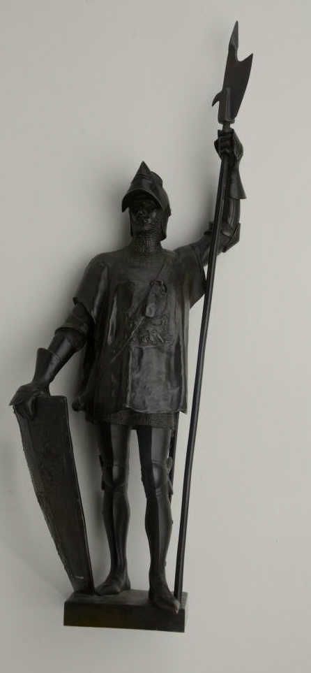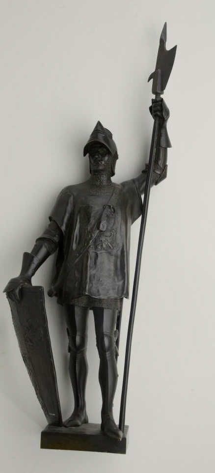 Fine antique bronze casting of medieval knight in armor holding shield and pole arm circa late 19th to early 20th century. The bronze measures 36 ½” from the tip of the pole arm to the edge of the base. The figureof the knight measures 26 ½” in height. The depiction is very well detailed and authentic with great armor and helmet. Also the shield is quite well detailed as are the authentic looking leg defenses. The bronze shows a dark patina and dirt and was consigned from a local doctors estate. An absolutely genuine antique that we are surprised is not signed but is definitely old and weighs approximately 44 pounds. Est.: $1,500-3000