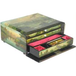 Fine early C19th papier-mache writing box painted overall with landscapes, the hinged twin panelled front enclosing 2 long drawers above pull-out writing slope, 11.75ins. wide (see illustration). Est.£1500/2000