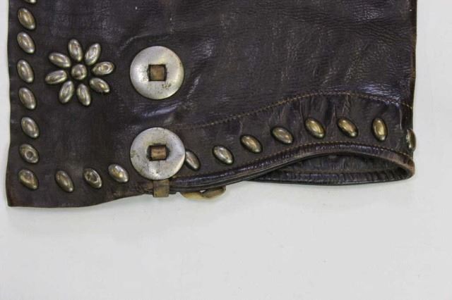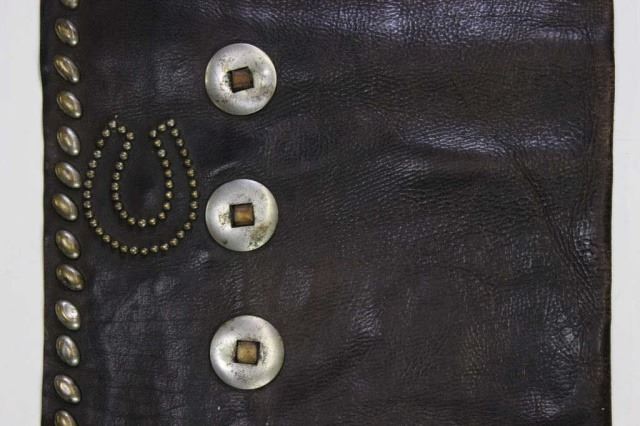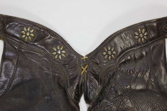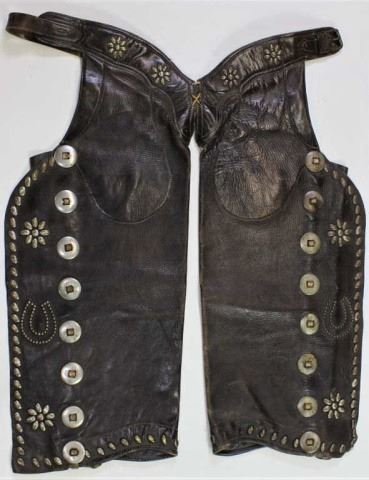 Fine early George Lawrence batwing chapsmaker stamped on tongue featuring 16 conchos on the legs, spotted around the perimeter of the wings and openings, with outside pockets, the bats show excellent condition and unaltered color. Est. 850-1500