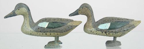 Fine early pair of folky miniature standing green wing teal ca. 1940 by Laurent Verdin Sr., a member of the Houma tribe. Approx 6 1/2" long x 3 1/2 " high. "B" brand on the bottom of one.