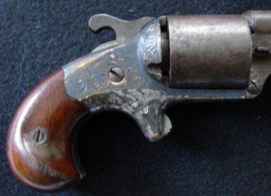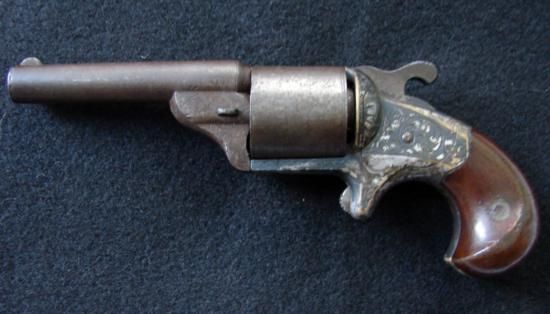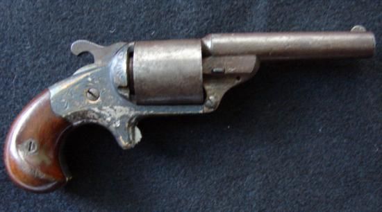 Fine first model MOORE Civil War period revolver. Matching numbers, smooth barrel, walnut grips retain most (70% plus) varnish, fine deep engraving with silver plated brass frame, uncleaned, but with 80% of the silver still remaining. Mwf1942