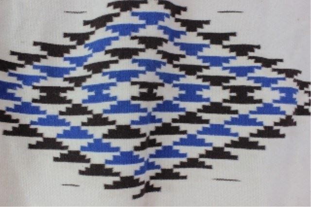 white background with blue and dark brown strips and geometric patterns, some light scattered stains but generally good, 50" X 80". Est. 150-300
