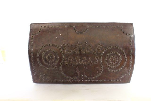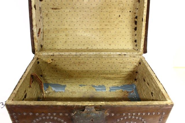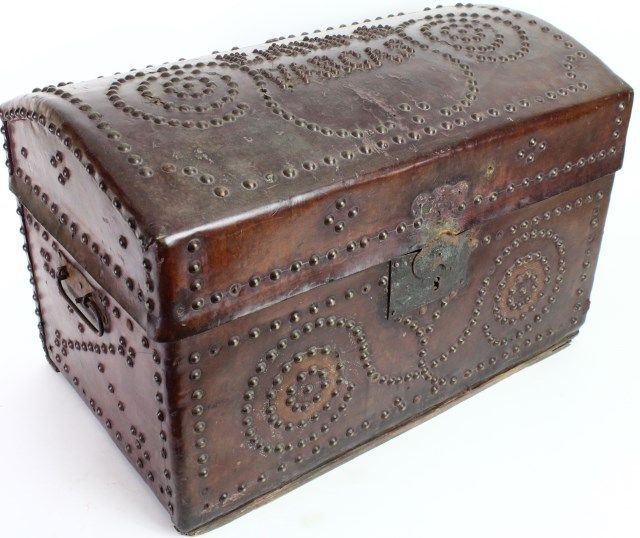 condition, leather shows deep brown patina, brass tacks dark with intricate pattern and full name applied to top. Original lock, iron handles and cloth lining intact. A superb example with good condition, age and look, 13" X 14" X 22". Est. 700-1400