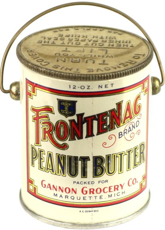 Fine little Frontenag Peanut butter tin, packed for Gannon Grocery Co. showing fine condition with strong colors, original lid and wire handle, 3 1/2" tall. Est. 75-150
