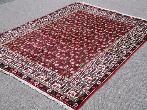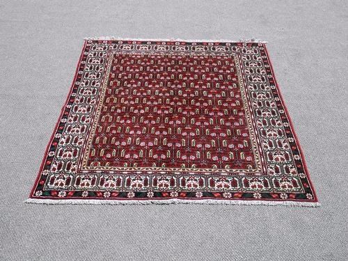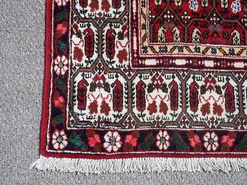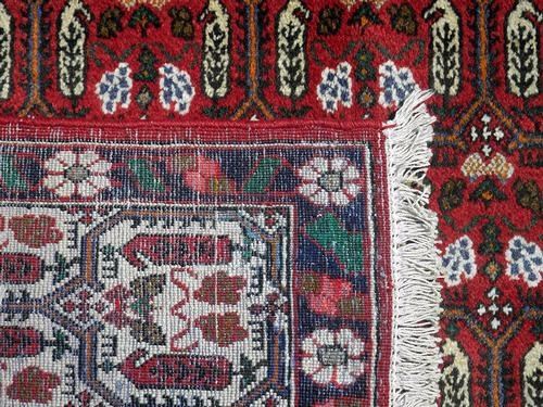Fine looking allover design authentic Persian Hussein-Abad Rug. Made of fine quality lamb's wool pile on cotton foundation, all natural vegetable dye, the lovely Rug incorporates an allover geometric design on a rich red background and is framed beautifully by an intricately done floral multilayer border. This is a dazzling and lovely Runner with its charming motif on a soft red background. This gorgeous Runner has a lustrous appearance due to the superior worsted wool, which also gives it a certain presence that is rare to come across in the market place. Hand woven in City of Hussein-Abad from Iran. Size: 5 feet 2 inches X 7 feet 1 inch.