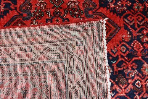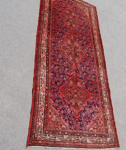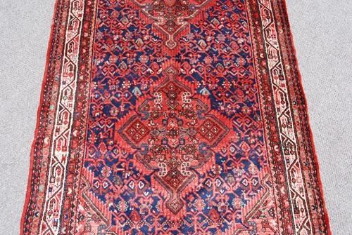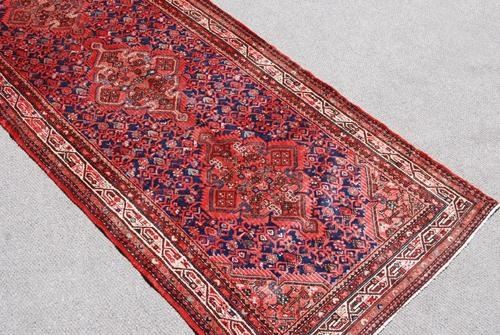 Fine looking authentic Persian Hosseinabad Runner. Made of fine quality lamb's wool pile on cotton foundation, all natural vegetable dye, the lovely Rug incorporates an three nice medallion on blue nay and red background and is framed beautifully by a geometric design border. This is a dazzling and lovely Rug with its charming motif on a soft blue nay and red background. This gorgeous runner has a lustrous appearance due to the superior worsted wool which also gives it a certain presence that is rare to come across in the market place. hand woven in Hosseinabad, Iran. Size 4 feet 6 inches X 10 feet 10 inches.