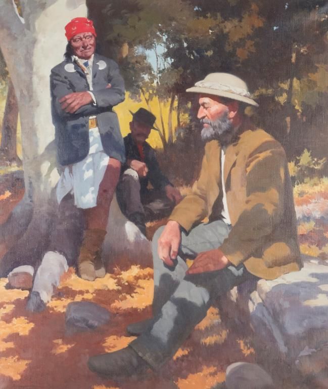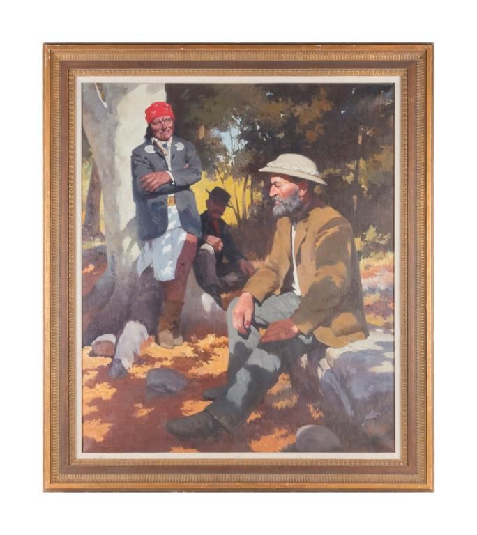 Fine original oil painting on canvas signed lower left Beaugureau portraying Gen. Cook and Geronimo. The painting measures approximately 34” x 40” not including frame. The condition is near fine with just a few minor storage scratches and could use a minor cleaning. Francis Beaugureau took classes at the Frederic Mizen Academy and the Art Institute of Chicago. He spent most of World War II as a B-17 pilot in England documenting his experiences with realistic paintings of aircraft in combat. After the War, he worked as a commercial artist and portrait painter; he also became a consultant to the United States Air Force, creating art programs and a USAF museum. Est.: $3500-$7000