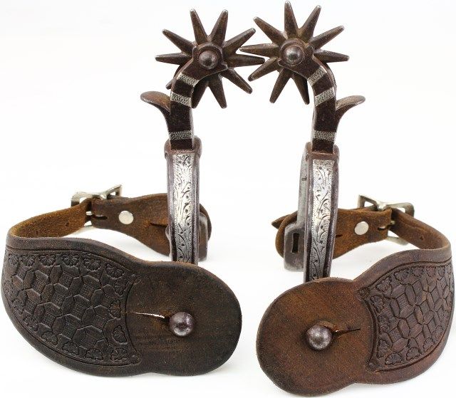 single mounted and engraved with 2" short drop shanks, chap guards, original 2" rowels, show good original condition, unmarked leather straps. Est. 800-1200