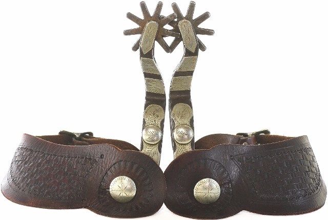 single mounted, very good unrestored condition, 3 1/4" heel bands, 2 3/4" shanks and 2" rowels. Includes unmarked leather straps. Est. 2000-2500