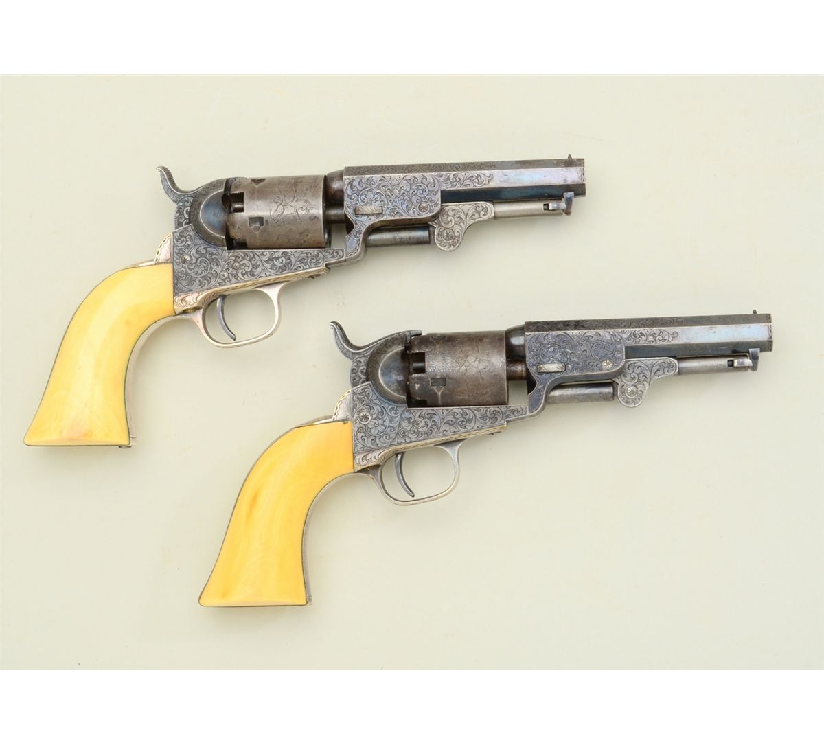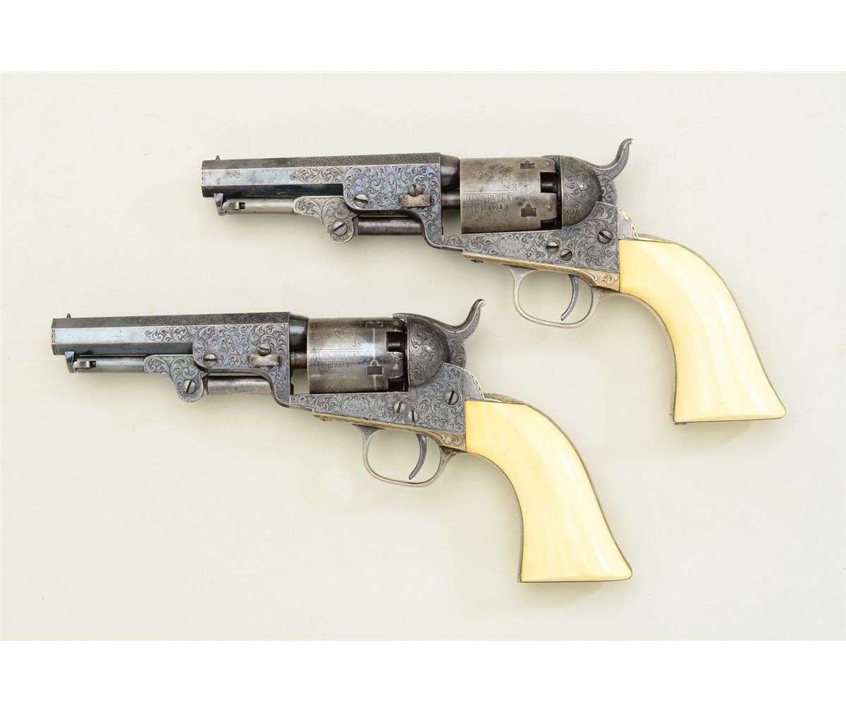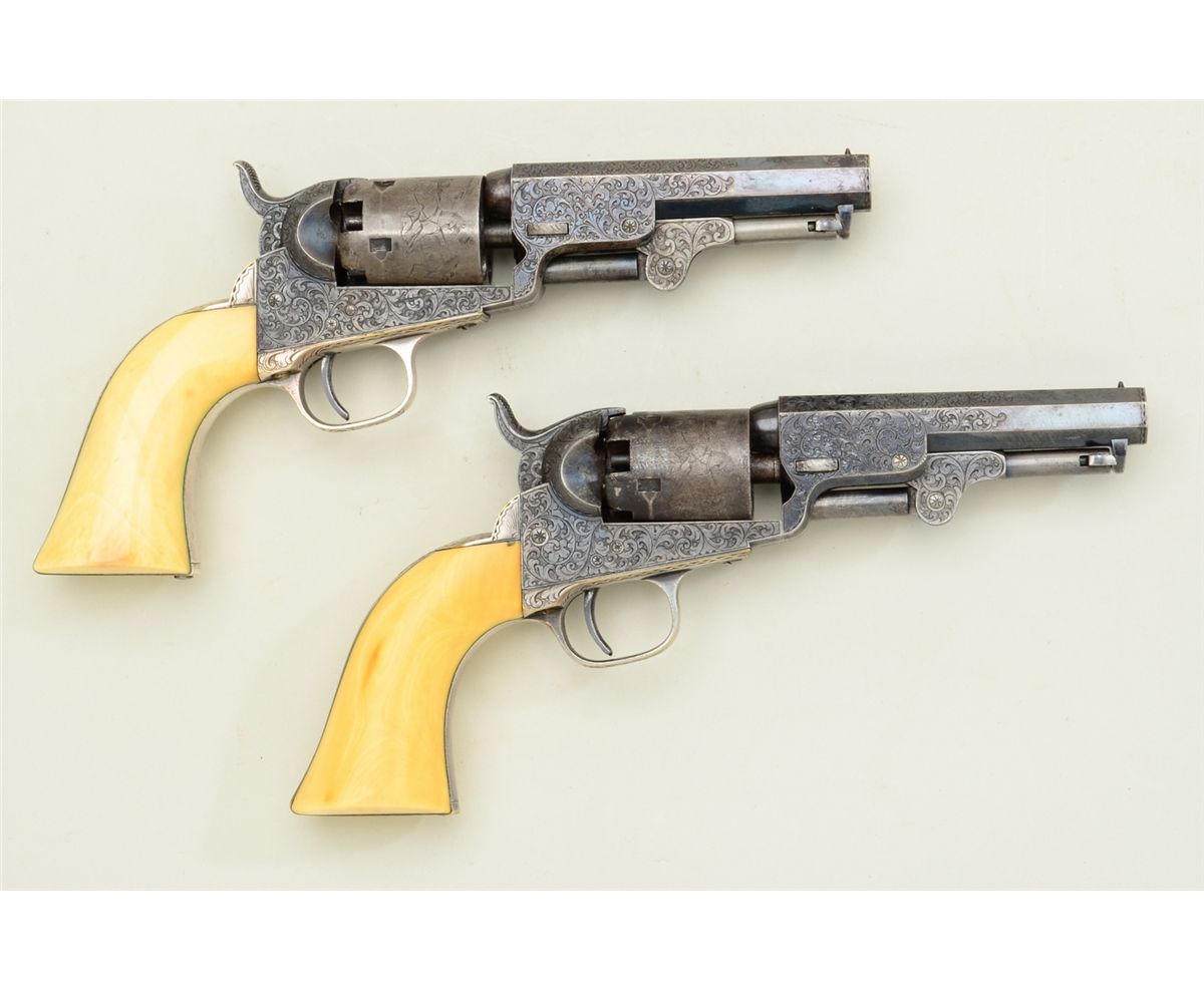 Fine pair of Gustave Young extra fancy engraved Colt Model 1849 pockets with 4” barrels, blue and case hardened finish, original ivory grips in deluxe original rosewood case, serial #’s 102803 and 102805. The pair show extra fine and fancy engraving in the hand of the master himself with finely cut scrolls, florals, parrot head, cobwebs and Colt’s patent hand cut in block letters on the center of each frame withSamuel Colt in script on each barrel. The pistols remain in near fine condition with 75-85% bright original blue on barrels, just natural beginning age and toning. Pistol number 102805 shows 50-70% original blue oncylinder with most of its original cylinder scene and an index line between stops. The frame, hammer and loading lever show 75-85% early case hardening which is toning nicely. The straps show 80-90% original silver andthe grips are fine to near excellent with yellowish patina. All matching serial numbers and crisp overall. Pistol number 102803 shows about 20-40% original blue on cylinder with most of its original cylinder