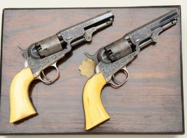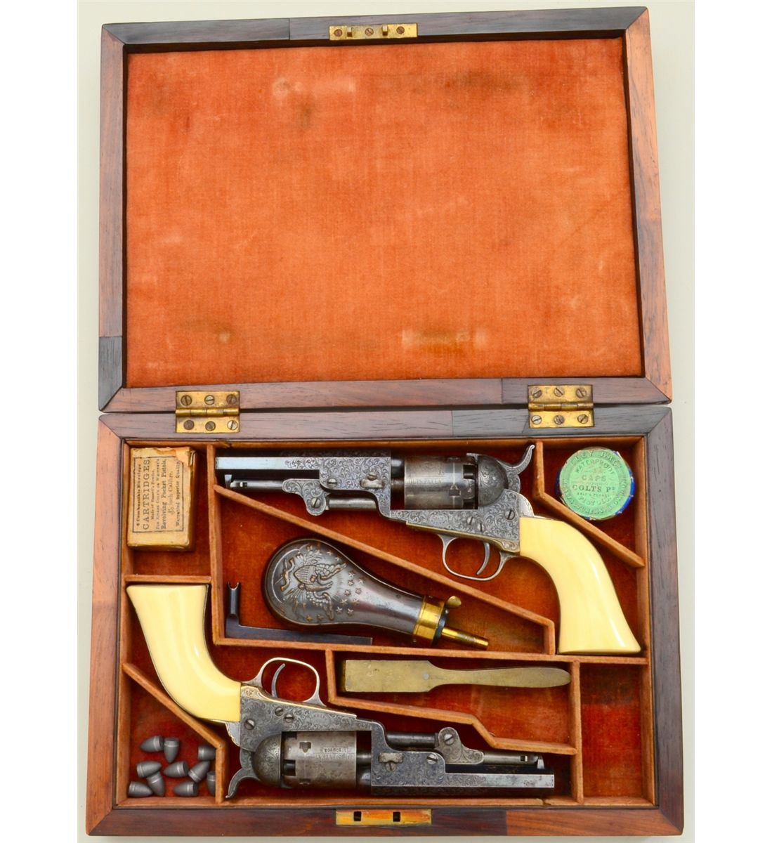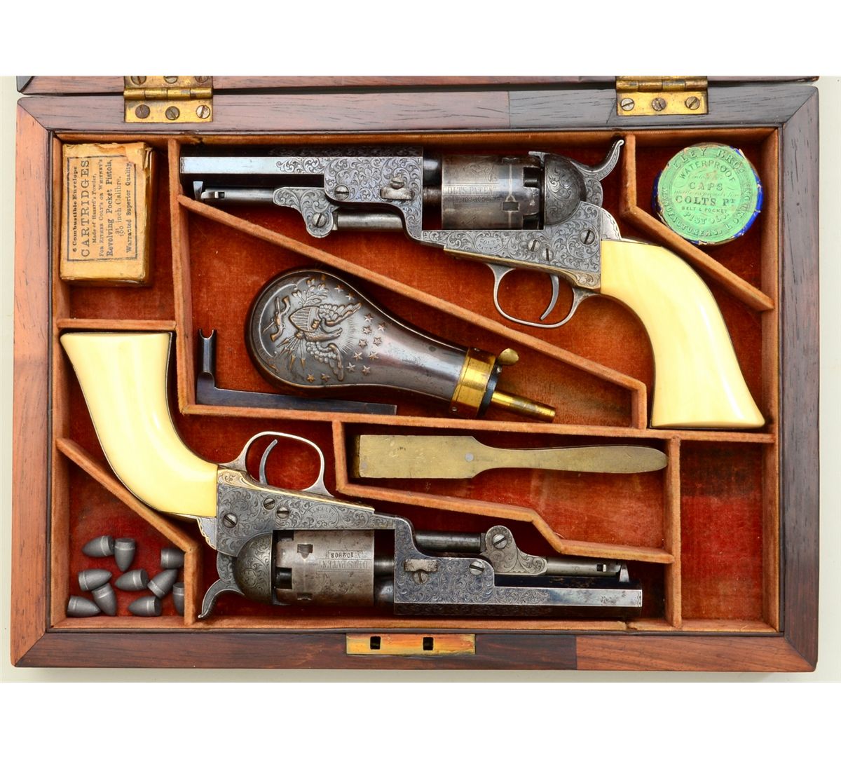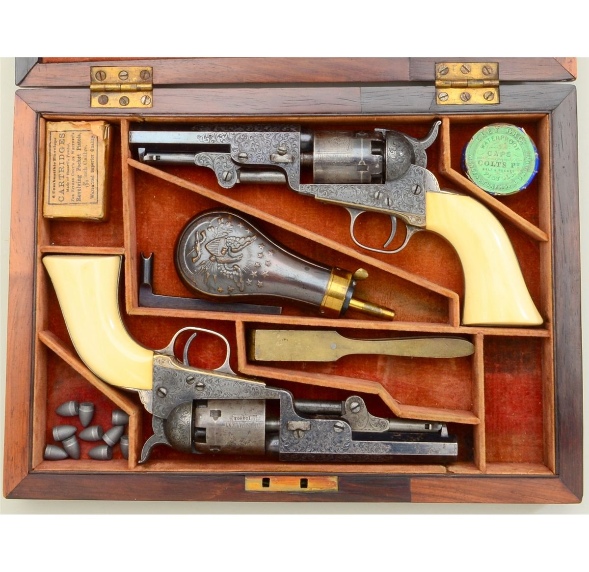 Fine pair of Gustave Young extra fancy engraved Colt Model 1849 pockets with 4” barrels, blue and case hardened finish, original ivory grips in deluxe original rosewood case, serial #’s 102803 and 102805. The pair show extra fine and fancy engraving in the hand of the master himself with finely cut scrolls, florals, parrot head, cobwebs and Colt’s patent hand cut in block letters on the center of each frame withSamuel Colt in script on each barrel. The pistols remain in near fine condition with 75-85% bright original blue on barrels, just natural beginning age and toning. Pistol number 102805 shows 50-70% original blue oncylinder with most of its original cylinder scene and an index line between stops. The frame, hammer and loading lever show 75-85% early case hardening which is toning nicely. The straps show 80-90% original silver andthe grips are fine to near excellent with yellowish patina. All matching serial numbers and crisp overall. Pistol number 102803 shows about 20-40% original blue on cylinder with most of its original cylinder