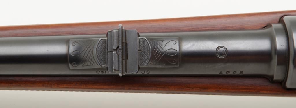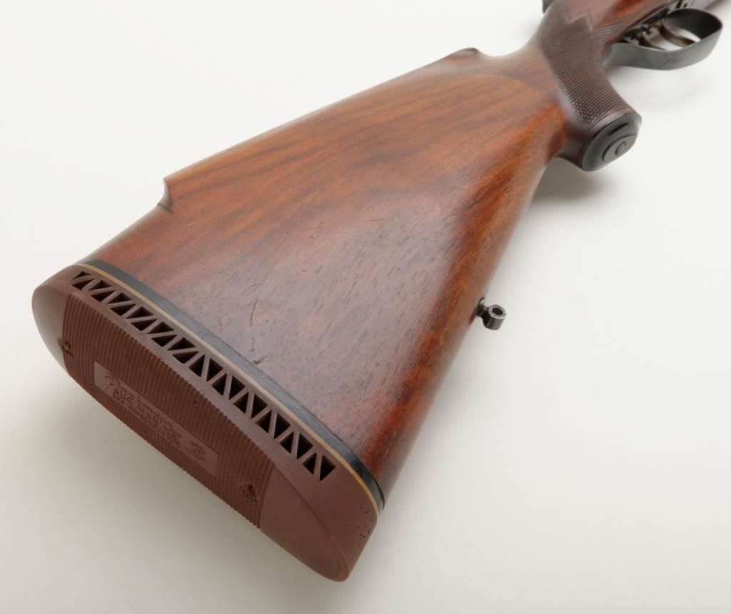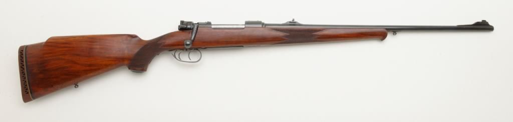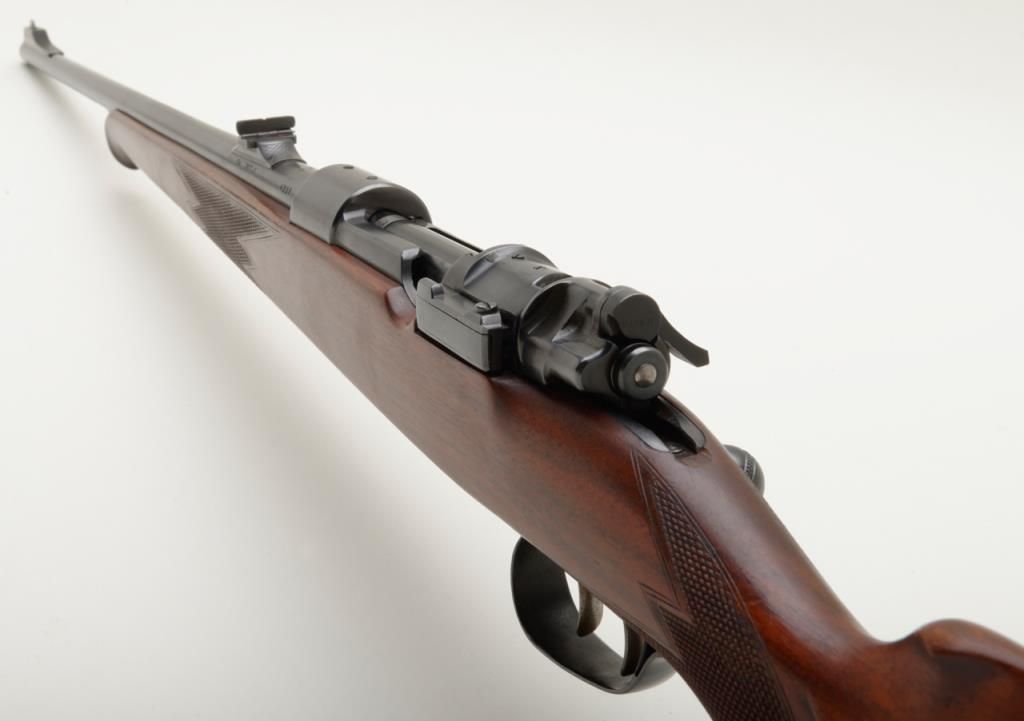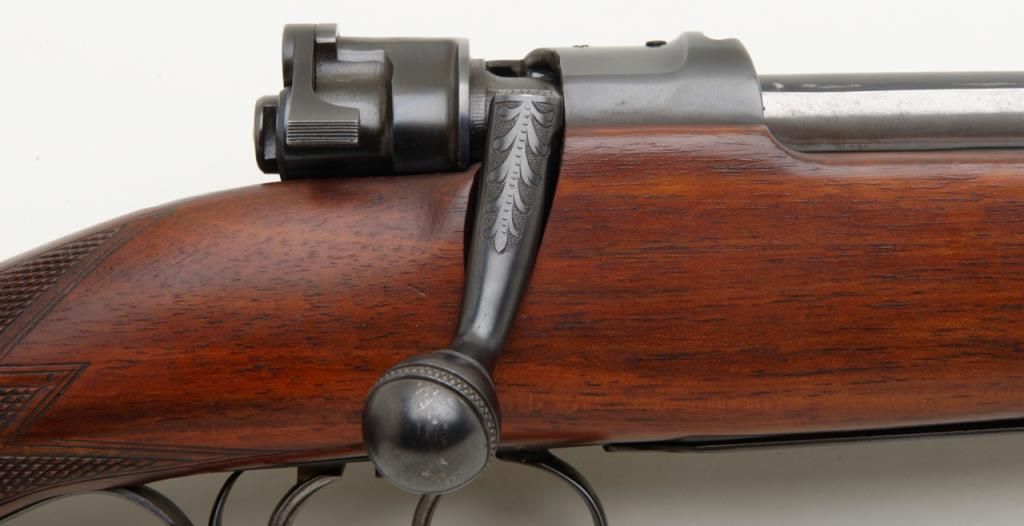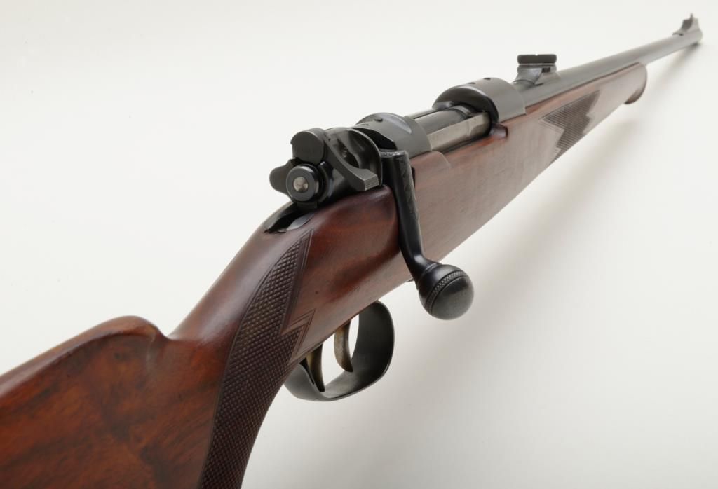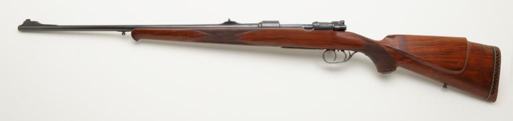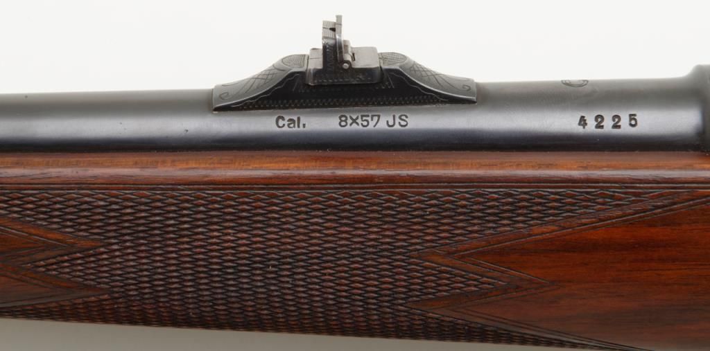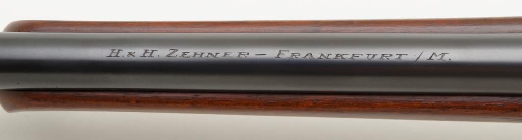 Fine quality German sporting rifle on 98 Mauser action signed H & H Zehner Frankfurt/M (Main) in 8×57 JS caliber, showing double set triggers and classic prewar German styling, serial number 4225. The rifle shows a 3 leaf folding rear sight with a long fore arm with Schnabel type front. Monte Carlo cheek piece for right-handed shooter, sling swivel eyelets for German type hook sling. Barrel measures 24 ½” and 45 ½” overall and of medium weight. The condition is fine to near excellent showing just some minor use 90% to the 95% over all. The Zehner family were highly regarded as gunmakers in Germany for almost 100 years. Est.: $700-$1400