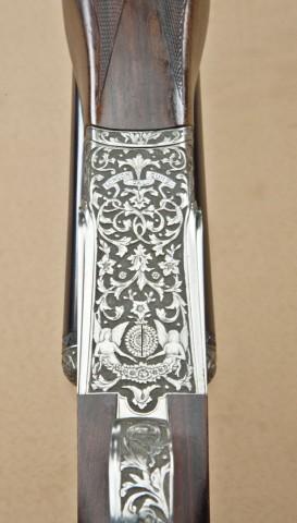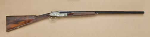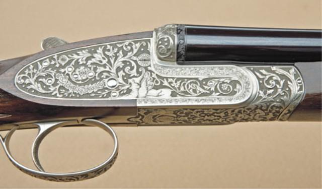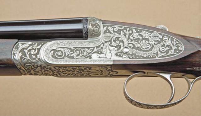 Fine quality Italian full-sidelock double-barrel 28ga shotgun by P. Constantene of Italy for Phil Katenes of London Guns, Santa Monica, CA, 1970’s to 80’s manufacture. Serial #7126. The gun shows elaborate deep cut semi-high relief engraving wit griffon and florals on each side, bottom of action shows angels, florals, and deep cut scrolls with full and elaborate coverage, signed Grauetti Inc. The gun shows 26-7/8” barrel, choked Cylinder and Modified. The barrels show 98-99% original blue finish. The action shows French gray or coin finish and is excellent. The stocks are of select grained walnut and show an English style straight grip, wraparound forend, finely checkered, single trigger, auto ejectors, with checkered butt and hand-filed raised rib, not ventilated. The stock measures 14-3/4” to the end of the wood. The action is tight, the bores are near excellent, the gun weighs 5.35lbs. London Guns imported high-grade Italian arms and this was a special display gun with ornate engraving used by London Guns as display until purchased by Robert Petersen. From the Robert Petersen Collection. Est: $7,000 - $14,000