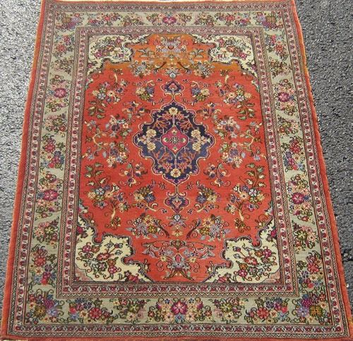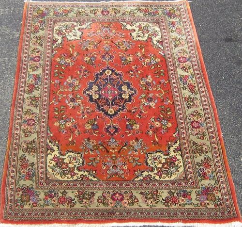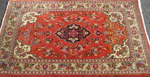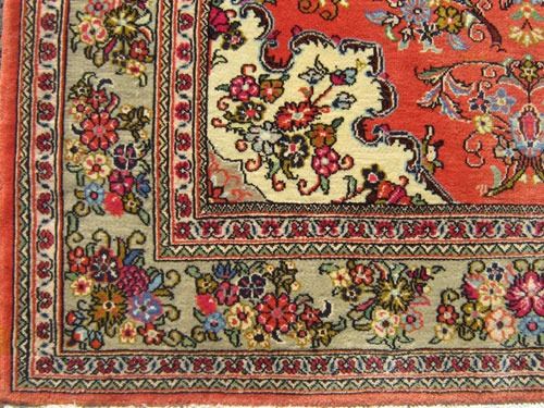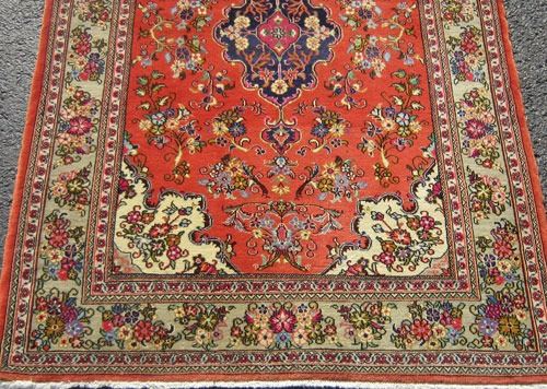 Fine quality baby lamb's wool pile persian qum rug. made of all natural, vegetable dye, hand woven, baby lamb's wool pile on cotton foundation. this is a lovely and lustrous fine quality qum with its stylized design on a orange color background. these fine pieces have not only the finest weave but also display a uniqueness in the broad range of designs and choices of colors. qum rugs therefore become the centerpiece and source of charm and pleasure in the household and the living quarters. this piece is masterfully hand woven, knot by knot, by master weaver. it would take a master weaver over two years to bring this beauty to life. Size: 4 feet 11 inches X 3 feet 5 inches. Country of Origin: Iran.