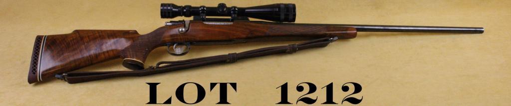 Fine quality custom sporting rifle on 98 Mauser action. Barrel marked “7-61” in 7mm caliber. Unidentified to which 7mm, possibly wildcat. Should be chamber cast. 4x12 power Redfield scope on Bueller mounts. Finequality checkering and figured walnut stock, quick detachable sling swivels, classic 1950’s to 60’s styling, attributed to Fred Shaw of Orange, CA. Very good to near fine condition, some scratches in wood. Anattractive rifle that would cost thousands to duplicate. Serial #NSNV. Est: $400 - $800