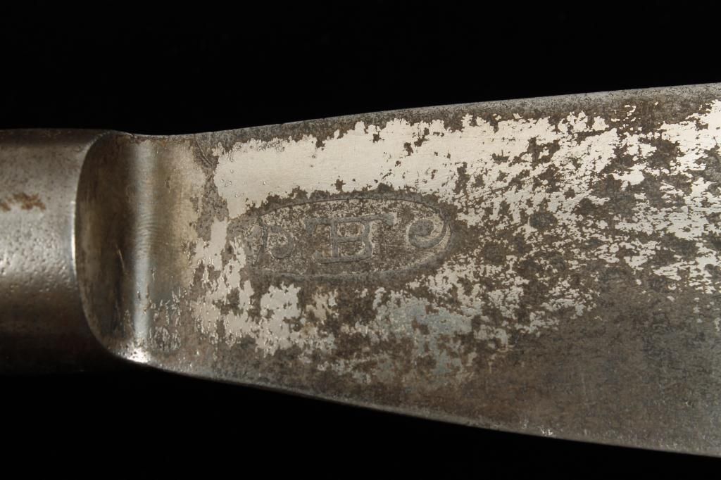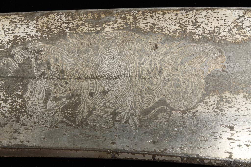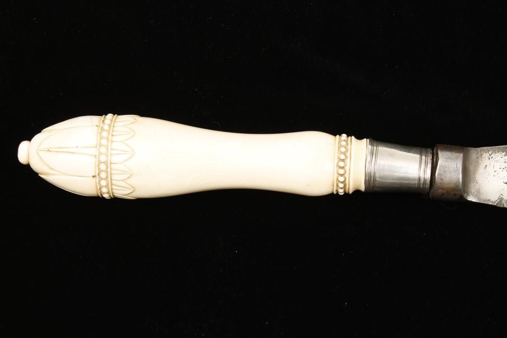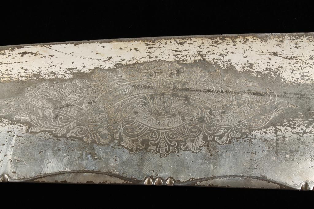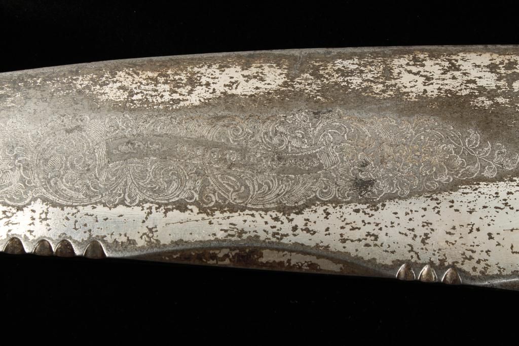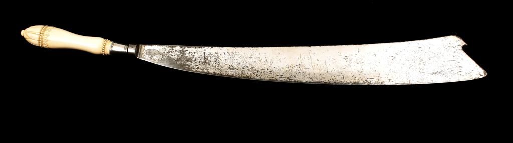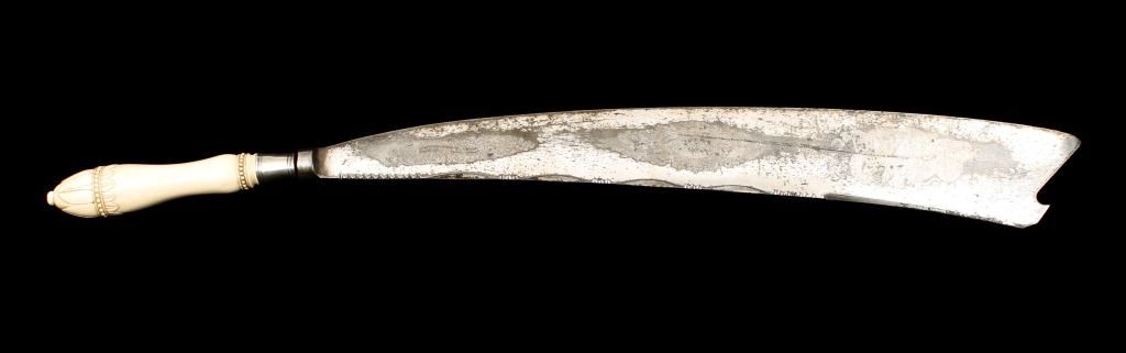 Fine quality exhibition style display knife or short sword with blade measuring 33 ½” overall with 25” blade which is nearly 3” wide at its thickest point. The blade is beautifully etched in silver plated and shows the makers name Neal’s at center portion with the British National Crest and London in fancy etched panels on each side. This maker displayed at the Philadelphia exhibition and probably took the style of this blade fromSoutheast Asian and Malaysian arms. The carved ivory grip is similar to other exhibition knives made in the 1870s. The blade shows 80% original silver starting to drift and peel and there is patina where theplating has lifted. The right side of the blade shows a trumpet with the letter B in a cartouche. There is a silver ramrod feral and the grip is in near fine condition. Est.: $1,500-$3,000.