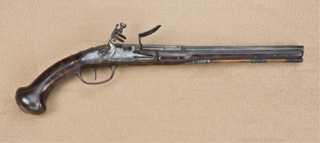 Fine quality late 17th to early 18th century French flintlock, horseman sized, pistol signed “Tanguy Le Guern Paris”. The pistol measures 18-1/2” overall with 12” barrel, of approx. .50 caliber. The lock is beautifully engraved in floral motifs with angels and serpents. The barrel shows excellent quality and gold inlay and engraving at breech, of which approx. 30% of the gold remains. The lock is in its original flintlock configuration. The handle has been broken at the neck and repaired. The top jaw and screw are good quality replacement. The top of the hammer is a good restoration. The stock shows an expert splice and repair to the forend which is almost undetectable and done by a master gunsmith The sideplate is raised silver and pierced, secured by two screws. The trigger guard and butt are plain iron. The stock is nicely molded and carved with floral at the tang. An elegant early pistol by a master maker. Est: $2,000 - $4,000