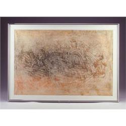 Fine, rare and large HARRY BERTOIA monoprint on rice paper, c. 1978, with bronze and copper inks depicting an abstraction based on Bertoia's proposed monoument for his Pennsylvania property, among the last works completed by Bertoia before his death. (From the collection of a friend of Bertoia's, provenance available). Matted and framed under glass. Unmarked. Image: 24" x 36" $9,000 - 12,000