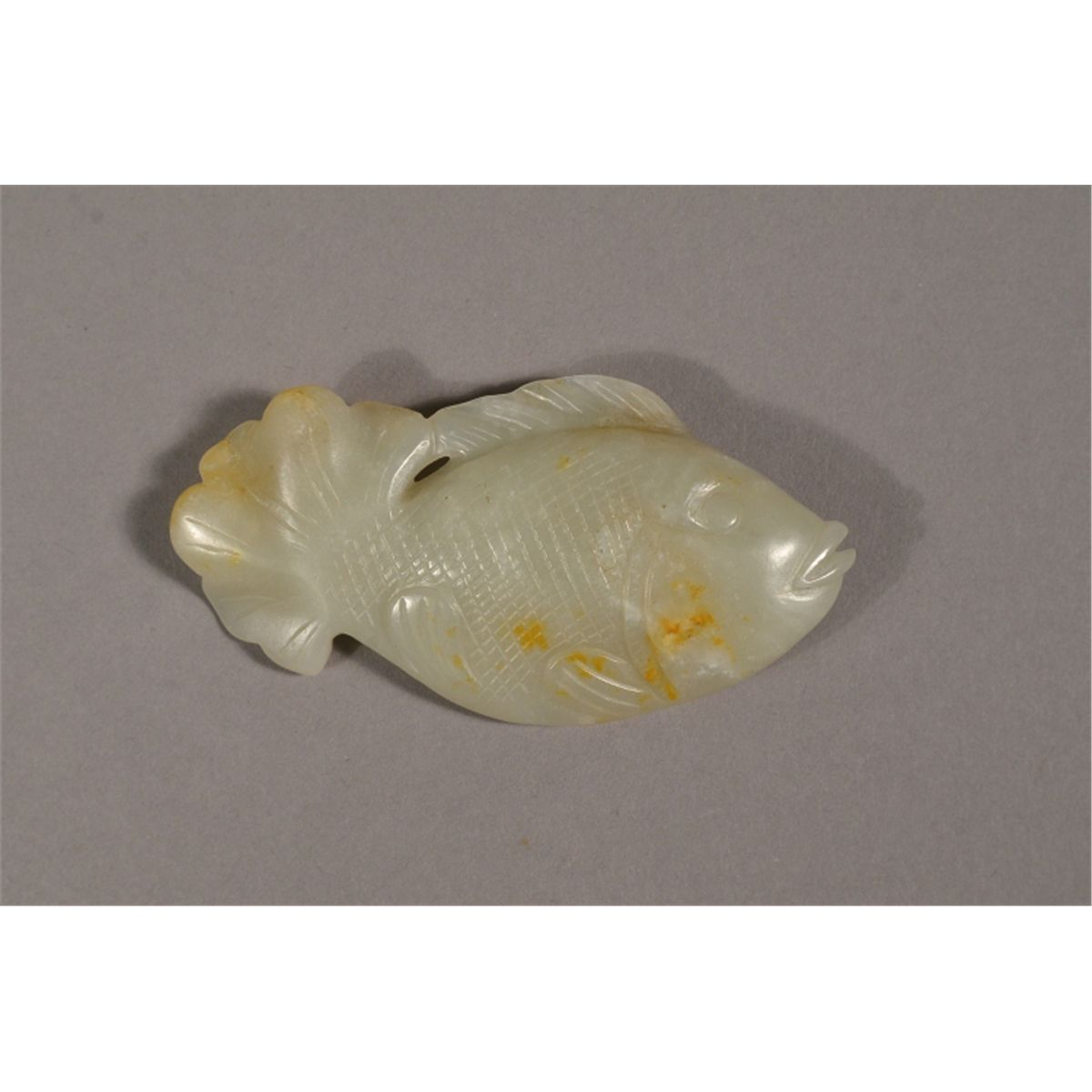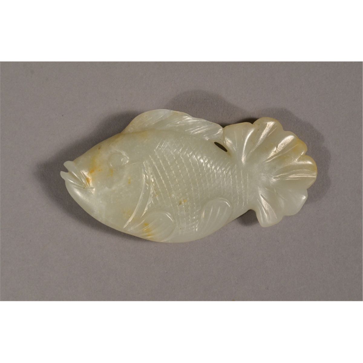 Finely carved Chinese white Hetian jade: featuring fish: finely incised scales and fins; with some russet suffusions; 17th/18th Century; L: 9 cm, W: 5 cm, H: 2 cm, 57 grams