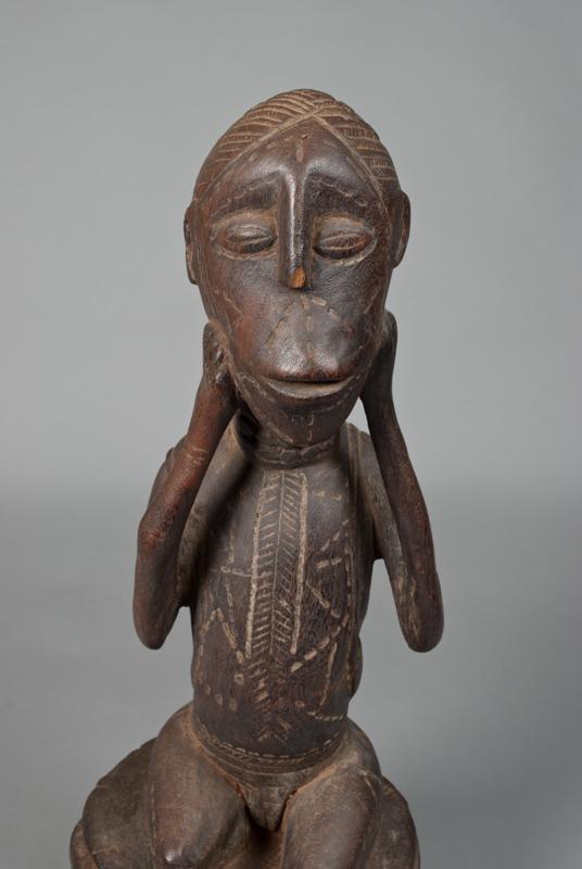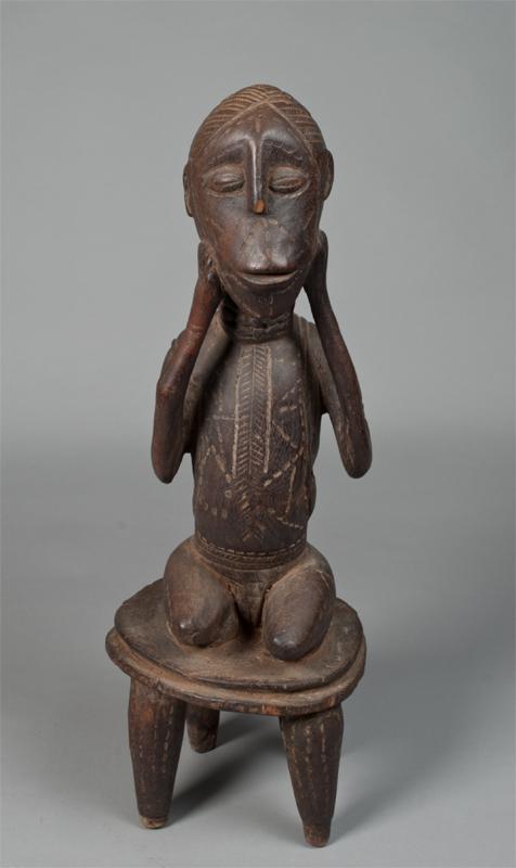 Finely carved male figure on stool with detailed face, hands at jawline, scarification, neck rings and corn rolled hair. The forested region of the Lower Zaire River is important in the artistic history of black Africa, because it boasts the greatest concentration of maternity figures and stone statuary. The focal point is the vast Yombe area where numerous individual styles may be found. The Kongo kingdom influenced the Yombe who, at one point of their history, were an integral part of this kingdom. The 350,000 Yombe people are artistically prolific. They produced some of the finest sculpture in all Africa. Their statues contained the same themes as the Kongo's: maternity figures, seated kings, objects of prestige, and nail and mirror fetishes. 25" H, wear and natural wood cracks throughout, small chip to nose. Mid. 20th century.
