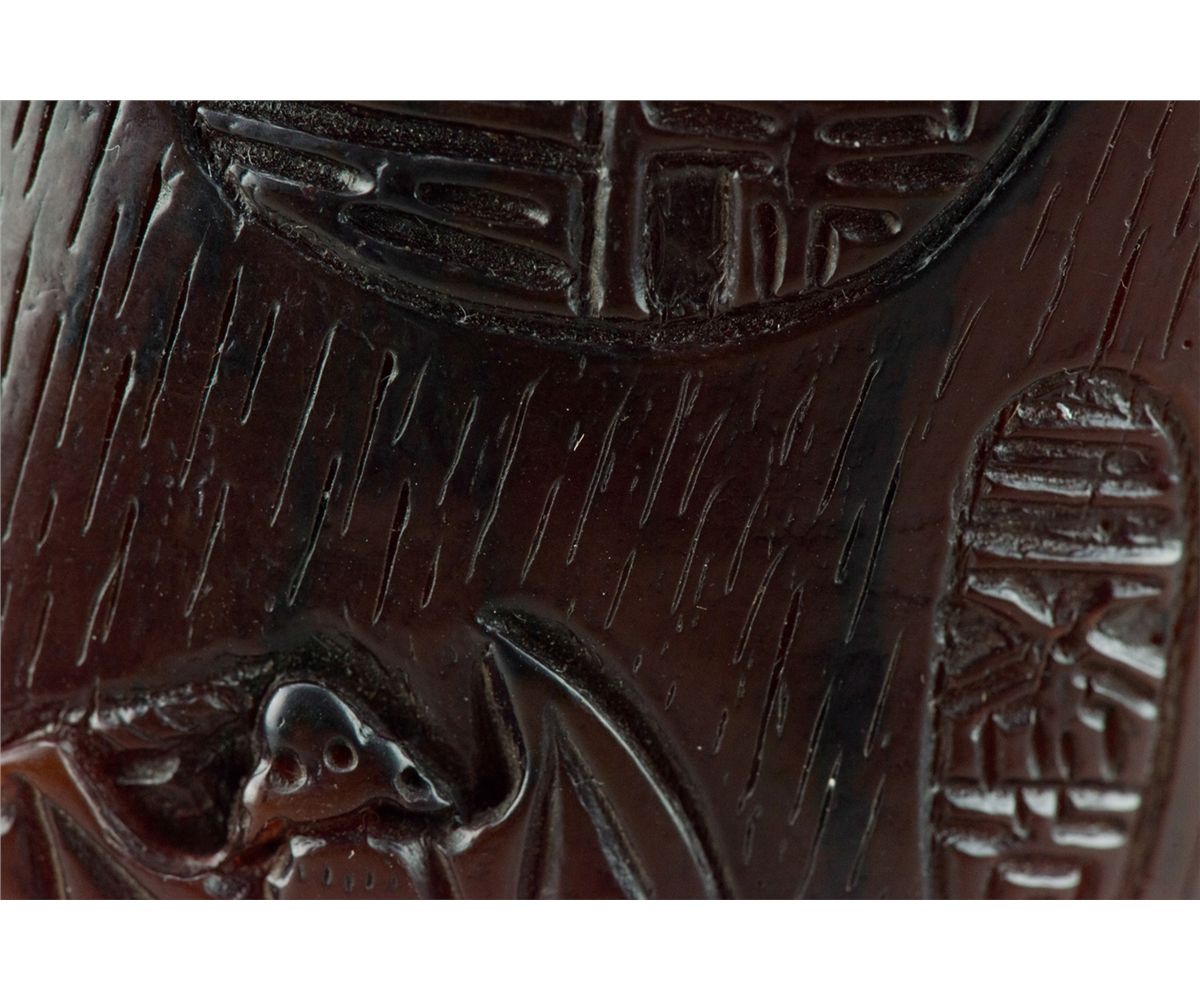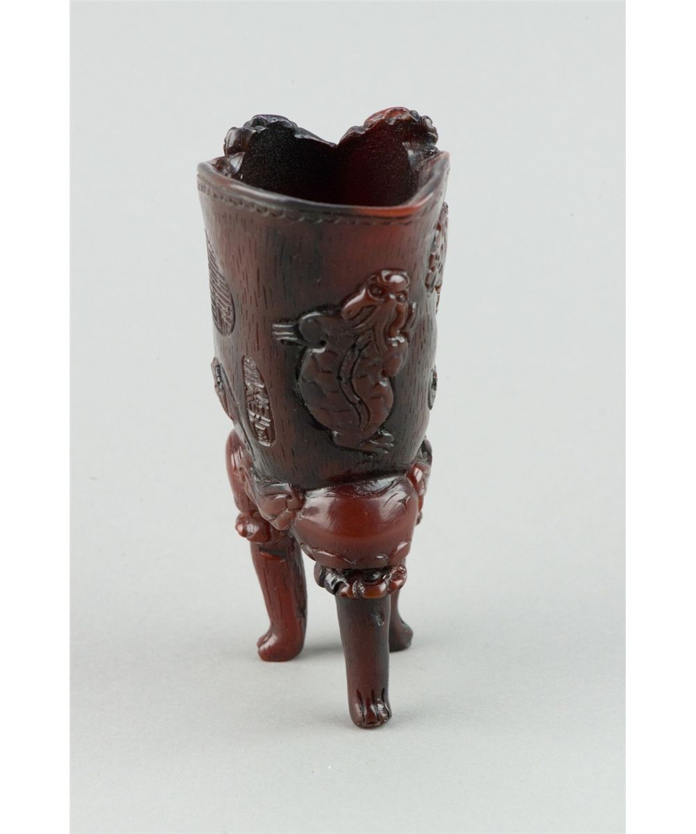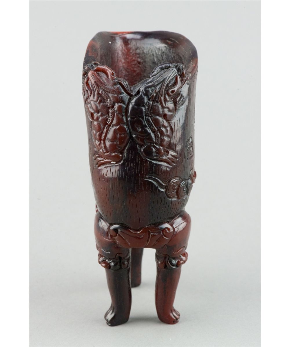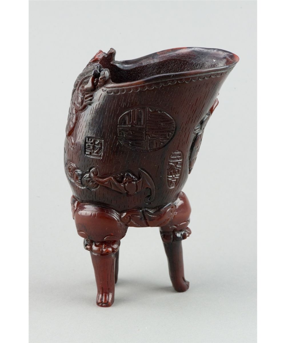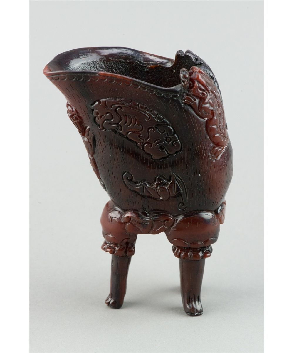 Finely carved Chinese horn carved tripod libation cup, featuring dragons and Qianlong stamp seals; H: 15 cm, W: 11 cm, 242 grams. Provenance: T. Ng Collection Toronto
