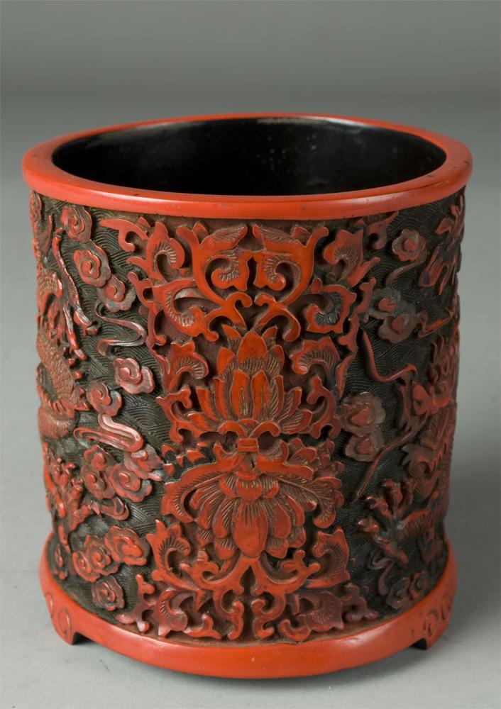 Finely carved depicting two 5-clawed dragons amid ruyi clouds and separated by two lotus flower and scrolled swag designs, resting on three feet. 5.25" H x 4 & 7/8" Dia. 19th/20th Century.