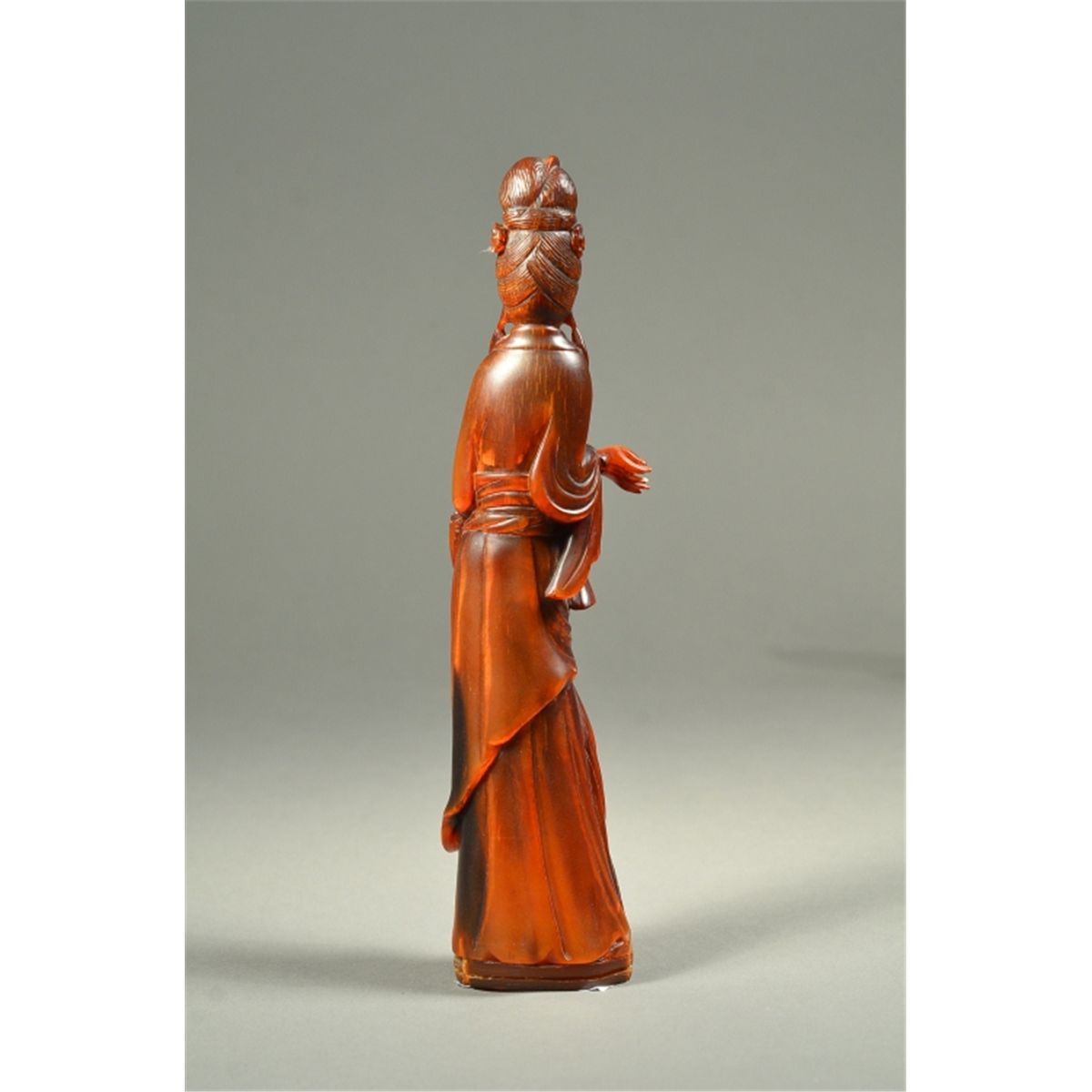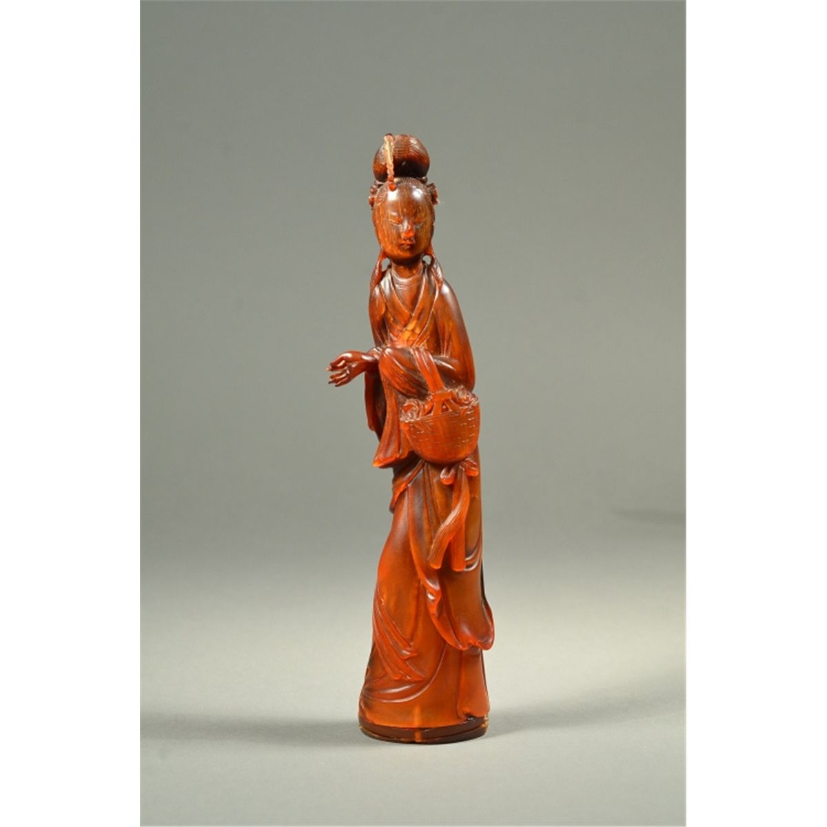 Finely carved Chinese Qing Period horn figure of Guanyin: holding a basket with outstretched hands; H: 23 cm