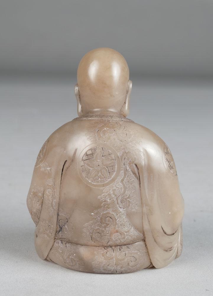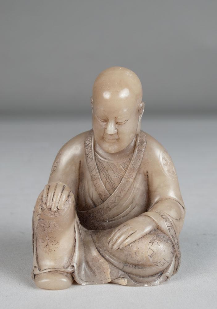 Finely carved to depict a seated Luohan, with one hand resting on his knee, fully robed. The robe carved with lotus within symbolic circles. 3.25" H, exceptionally well done. Circa late Qing dynasty.
