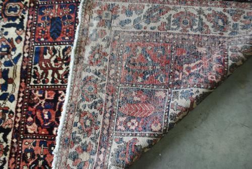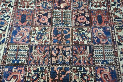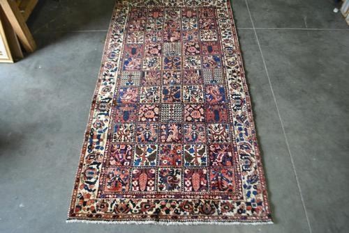Finely done hand woven hybrid design Persian Bakhtiari runner is what you are about to bid.Size 9.8 X 5 feet, made of fine quality lamb's wool pile on cotton foundation, all natural vegetable dye, incorporating a hybrid design that incorporates both floral and hunting motifs on a dark background; center row of medallions and an intricately done floral border. Hand woven in Bakhtiari, Iran.