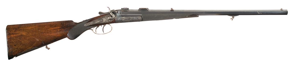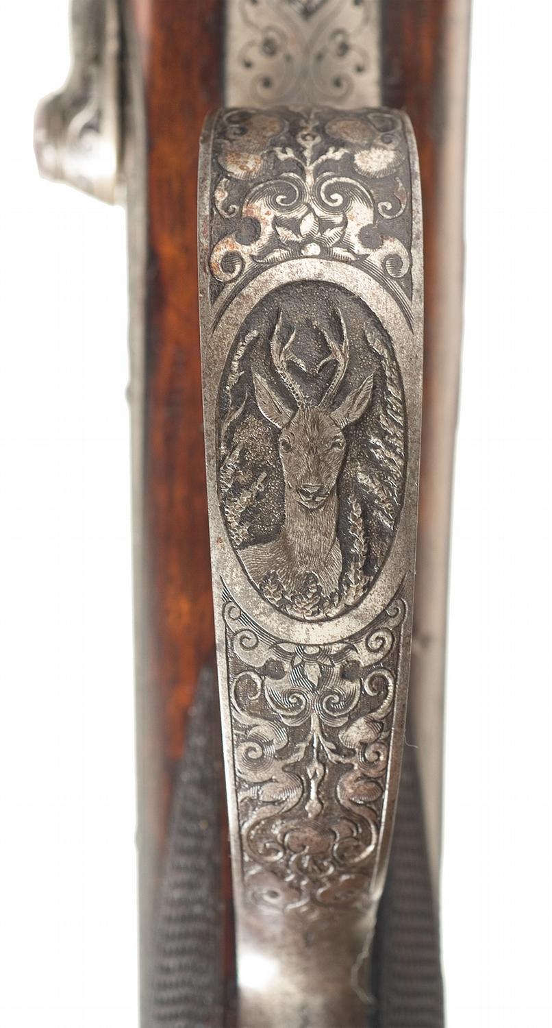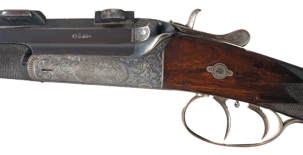 Blade and adjustable notch sights, with a pair of claw mount bases installed at the rear, cutting through the makers address. Excellent relief cut scroll engraving on the frame, hammer, trigger guard, side lock plate, tangs and cartridge compartment lid, with scenes of deer in the woods on either side of the frame, a deer head on the trigger guard, and a pair of hunting dogs on the lock. Equipped with a low profile flip-up peep sight on the upper tang and double set triggers. Checkered knob grip stock with engraved forearm hardware, sling swivels, cartridge compartment on the underside of the butt and a serrated horn buttplate. Marked "7.8mm/ 72" under "BUG" commercial proofs on barrel under forearm.