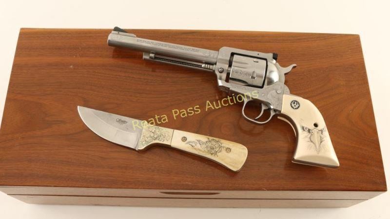 Cased set consisting of an engraved stainless steel Ruger New Model Blackhawk single action revolver chambered in .357 Magnum, and a custom 9" stainless steel skinner with 3 5/8" blade, hand scrimshawed caribou antler handle & hand made mosaic pins. Both of these items have been finely hand engraved by Master Engraver Roland J. Robidoux and include certificates of authenticity. Features a brushed finish, light coverage floral scroll engraving, 6.5" barrel, raised ramp front sight, adjustable rear window sight, flat-top frame, ejector rod, fluted six-shot cylinder, smooth trigger and two-piece hand scrimshawed bonded Caribou ivory grips with an eagle on the left side & bear on the right. Includes a wood presentation case with plush interior. Revolver exhibits some handling marks and displays visible cleaning marks throughout. Action is smooth with solid lock up, bore is excellent and bonded ivory grips are fine. Condition is very good+++. ***Modern Firearm***