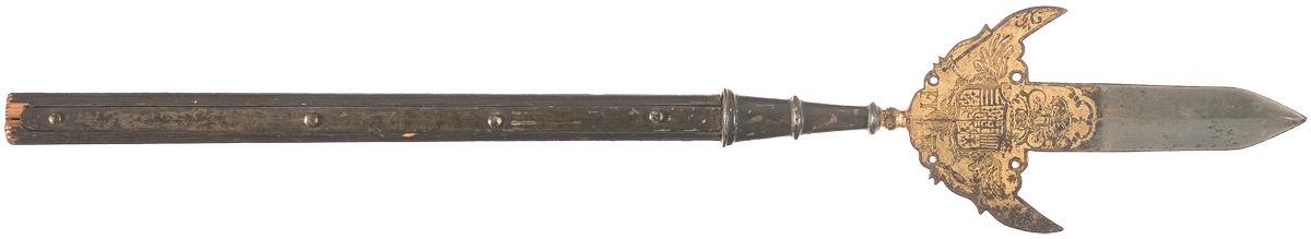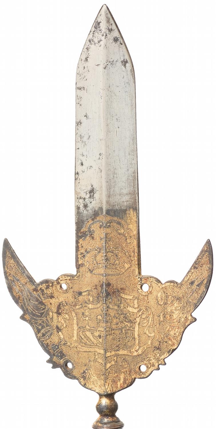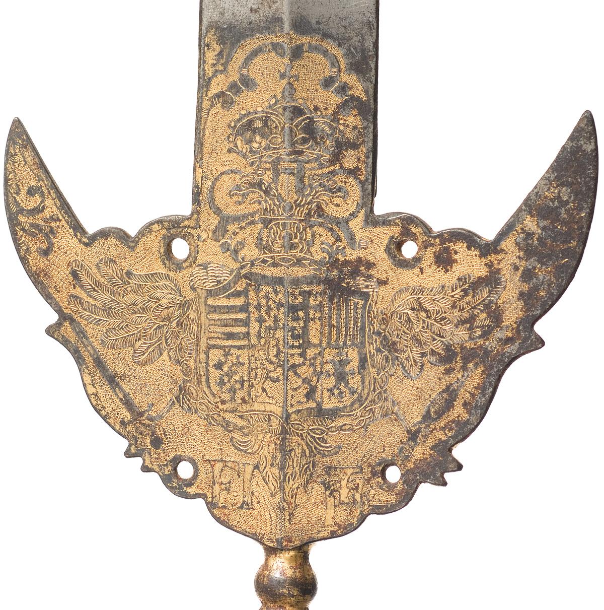 Measuring 12 1/2" tall from tip to base, the head is of the ranseur profile, with a double edged central blade measuring 6" and a central body at the base with a pair of 4" long forward projection spikes. Both sides of the base and spikes are etched with engraved accents and gold wash, showing elaborate crowned coats of arms on each sides, along with a double headed eagle on one side and stands of flags and a village scene on the reverse. A set of four holes is present in the base section, possibly for hanging banners or ribbons. The support arms are 14 1/2 inches long and 1/2" wide, secured to the shaft with 4 rivets.