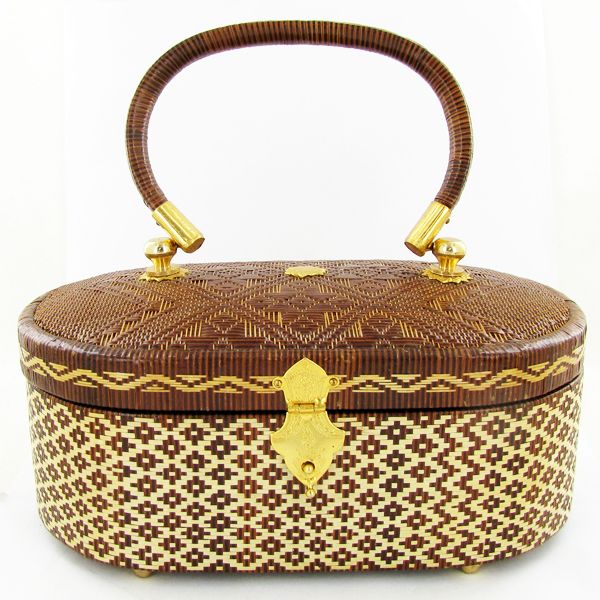 A week of work in this finely, tightly woven Lipao vine handbag, gold plated hardware, silk lined with mirror; 7" wide