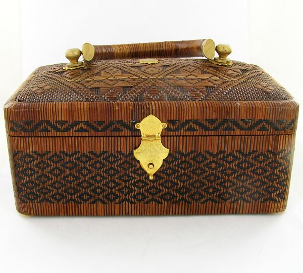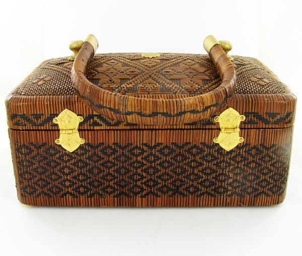A week of work in this finely, tightly woven Lipao vine handbag, gold plated hardware, silk lined with mirror; 7" wide