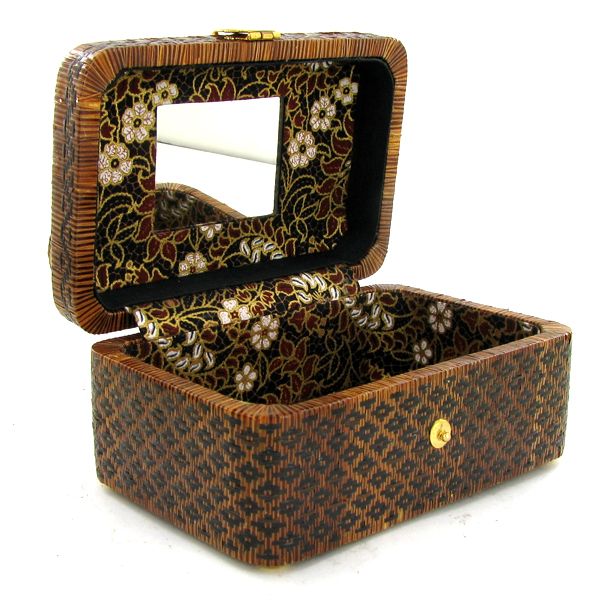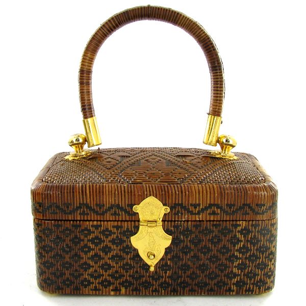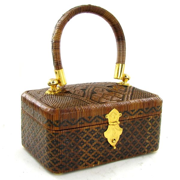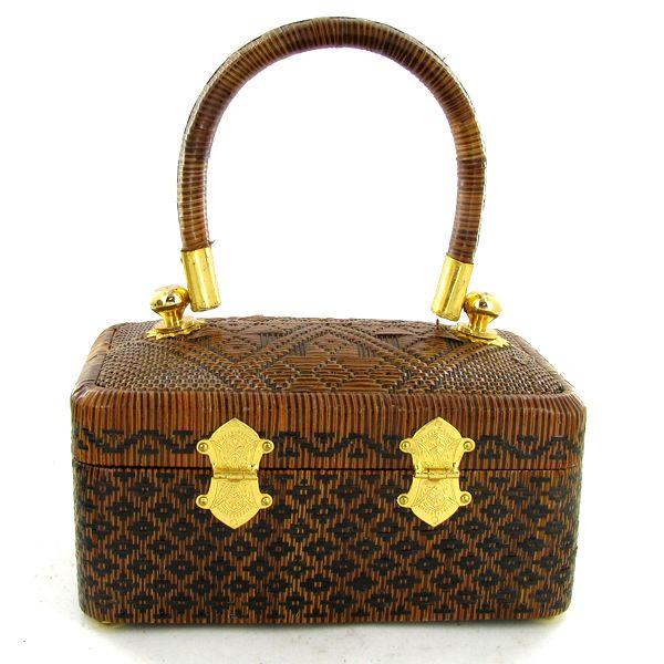 A week of work in this finely, tightly woven Lipao vine handbag, gold plated hardware, silk lined with mirror; 5.5in wide