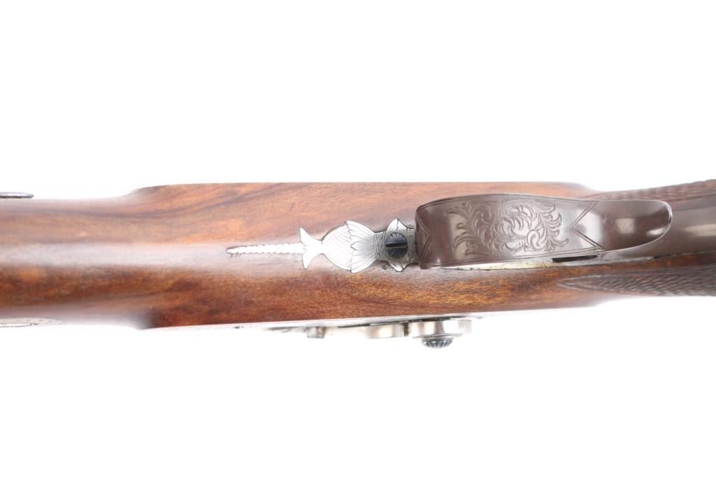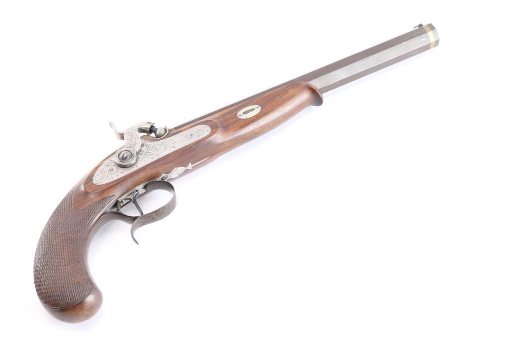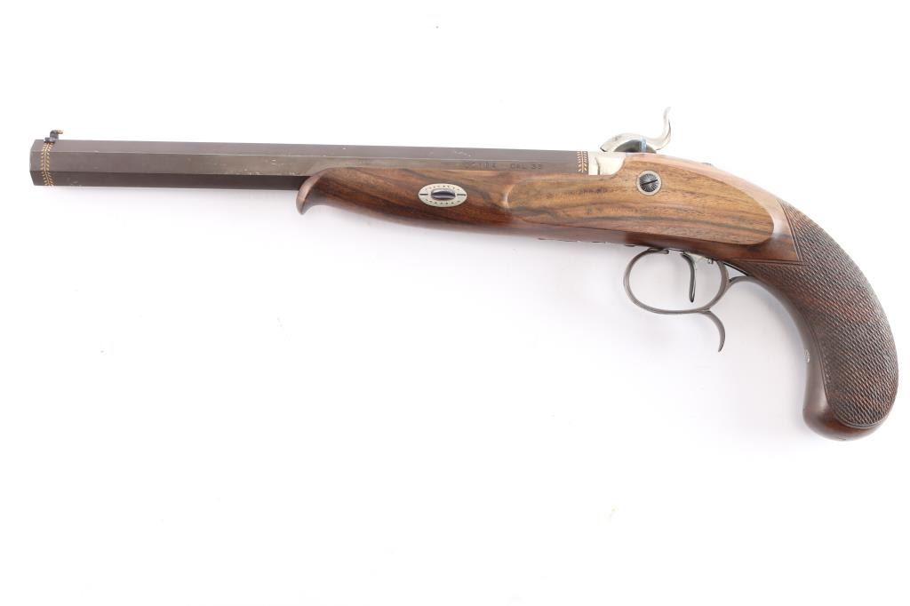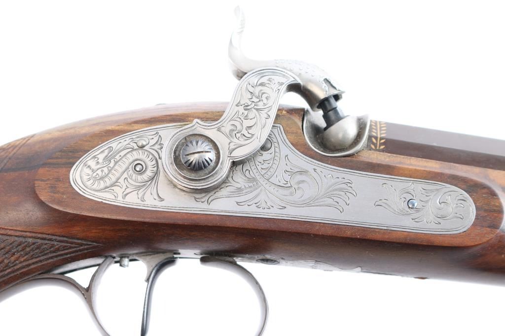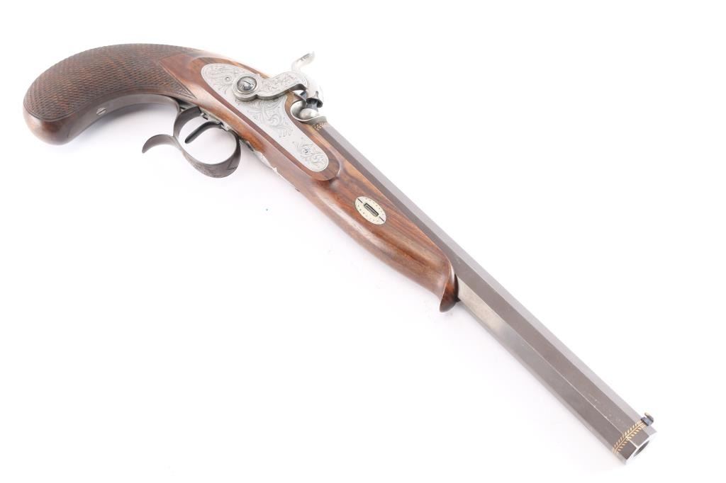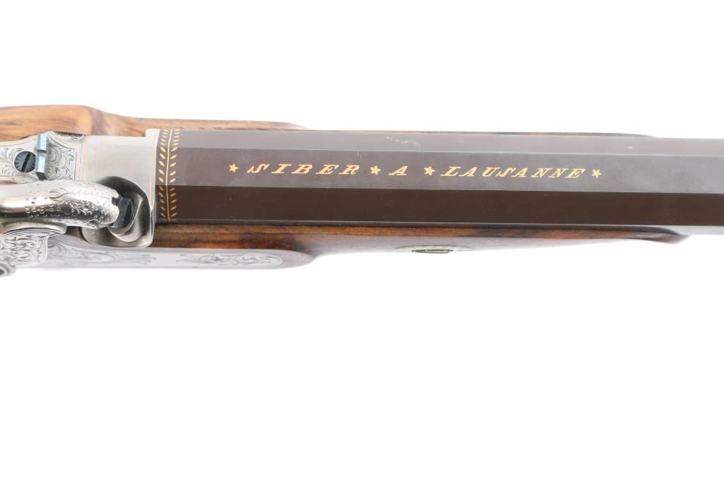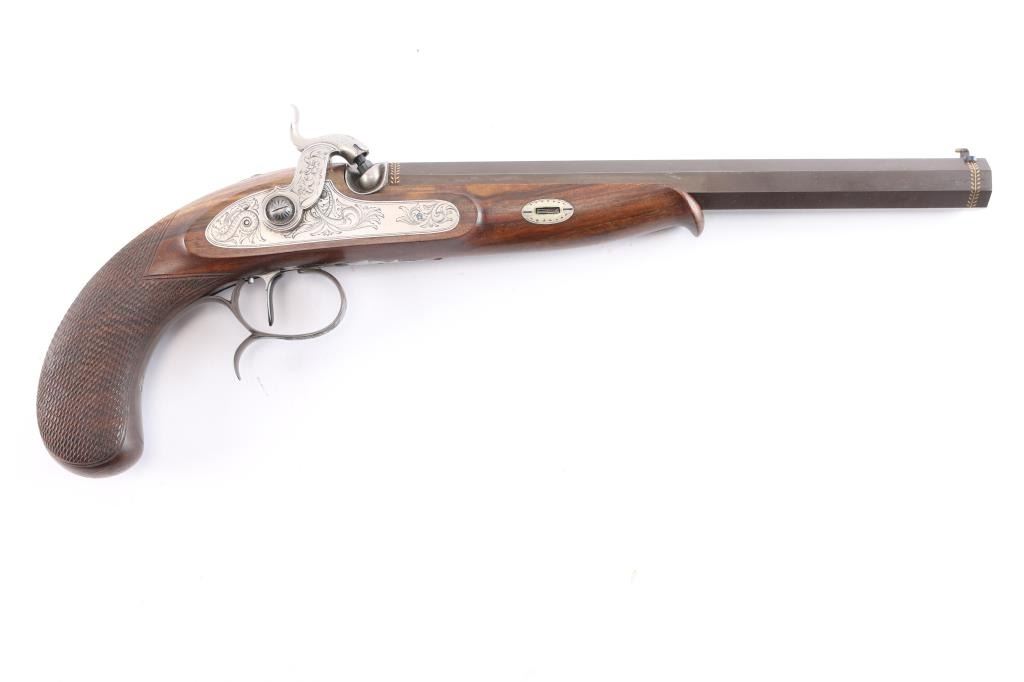 By Hege of Uberlinger Germany patterned after mid-19th Century original by Jean Siber of Lusanne, Switzerland, and gold inlaid with his name on the bbl. Approximately 16" overall with 9 1/2 medium weight octagon bbl of approximately 33 cal rifled. Half stocked with nicely checkered stock, engraved mounts, gold inlay on browned bbl with French style bright polish on lock and breach. Numbered 00164 and 33 cal marked on left side of breach. Adjustable set trigger. Absolutely as well made as a mid-19th Century European pistol. From the collection of "Bill" Ruger.