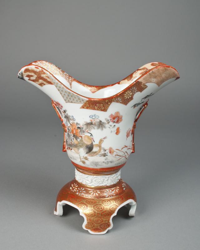 Footed urn with body painted to depict ducks in a landscape, with two raised ribbon handles, and below raised floral band, all highlighted in gilt. 9.75" H x 9.5" W, signature in iron red on underside. 20th century.