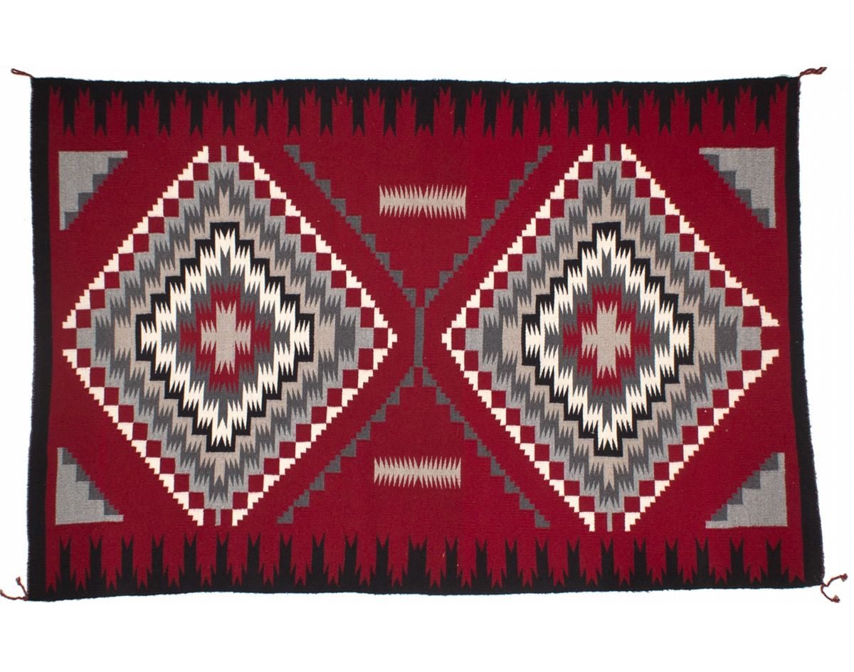 This 45 x 69 rug features tightly woven, finely detailed serrated patterns in traditional red, black, heather, natural, light grey, and dark grey colored wools. Excellent condition. This rug features clear lazy or sectional lines, which indicate that the weaver worked on one section, moved on to another section, and then the two sections met to form a diagonal join. Navajo rug authenticity is established through several indicators, and the presence of lazy lines is one such sign of authenticity. Machine made rugs do not feature lazy lines, and most other weaving cultures do not work in the same way that Navajo weavers do. From the Tahoe Wovoka Estate Collection. Wovoka Collection HKA#63123