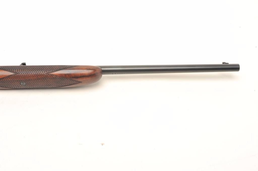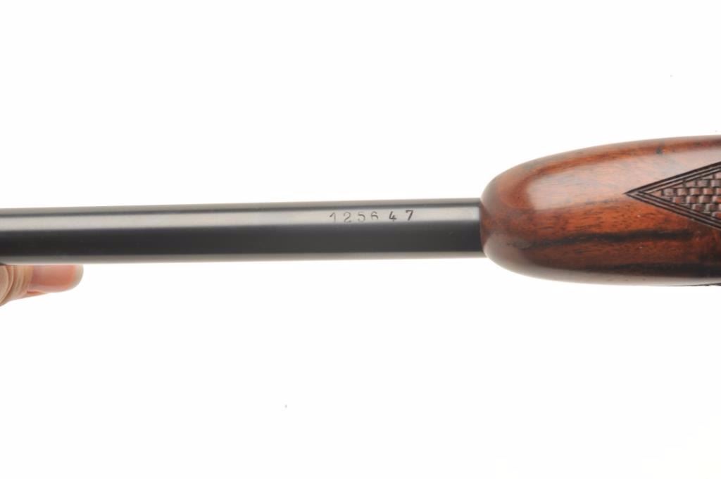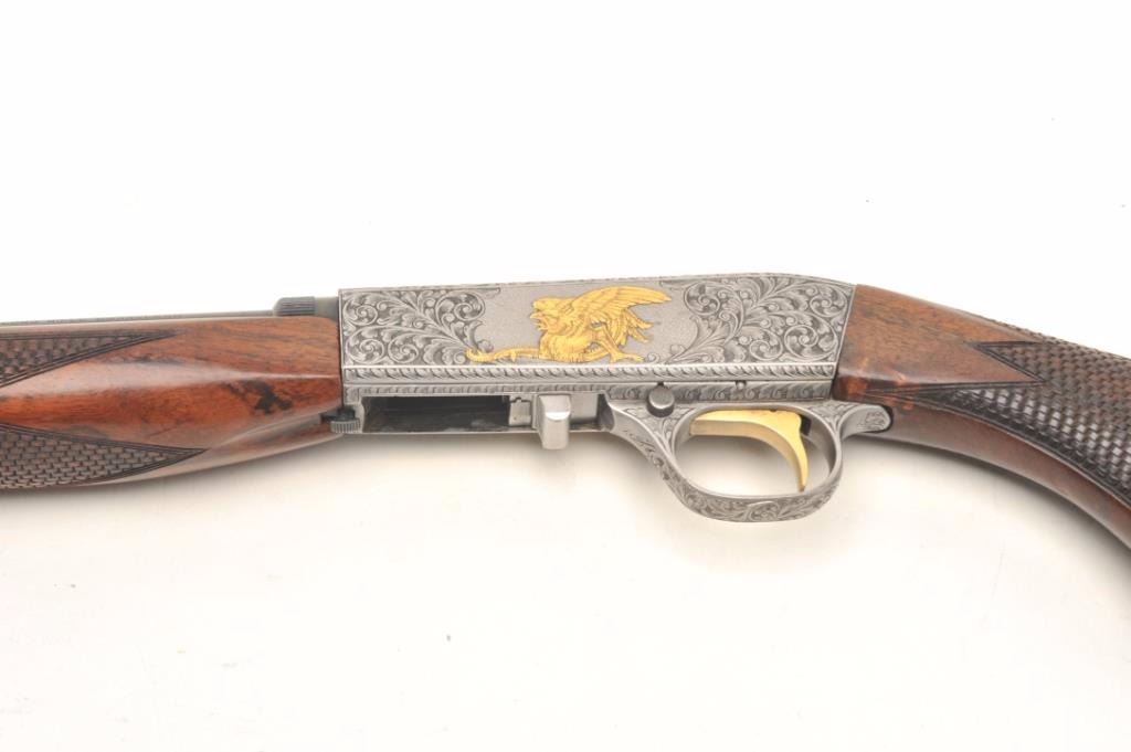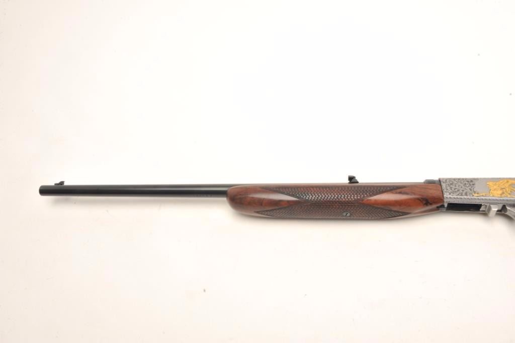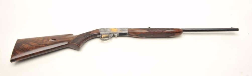 Finely and fully Angelo Bee engraved and gold inlaid gargoyle panel scenes Belgian Browning .22 LR caliber takedown rifle, 19” blued barrel, gold trigger, deluxe checkered finely grained wood stocks, S/N 125647, inoverall excellent condition as outstandingly engraved by Master Engraver Angelo Bee with Certificate of Authenticity signed by Bee and numbered to this gun. A superb work of firearm artistry by one of the best knowncontemporary engravers. (Modern). Est.: $4,000-$8,000.